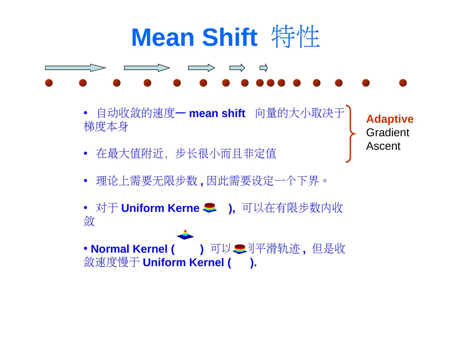 26 . Mean Shift 特性 • 自动收敛的速度– mean shift 向量的大小取决于 Adaptive 梯度本身 Gradient Ascent • 在最大值附近,步长很小而且非定值 • 理论上需要无限步数 , 因此需要设定一个下界。 • 对于 Uniform Kernel (PDF) ), 可以在有限步数内收 敛 • Normal Kernel (PDF) ) 可以得到平滑轨迹 , 但是收 敛速度慢于 Uniform Kernel (PDF) ).