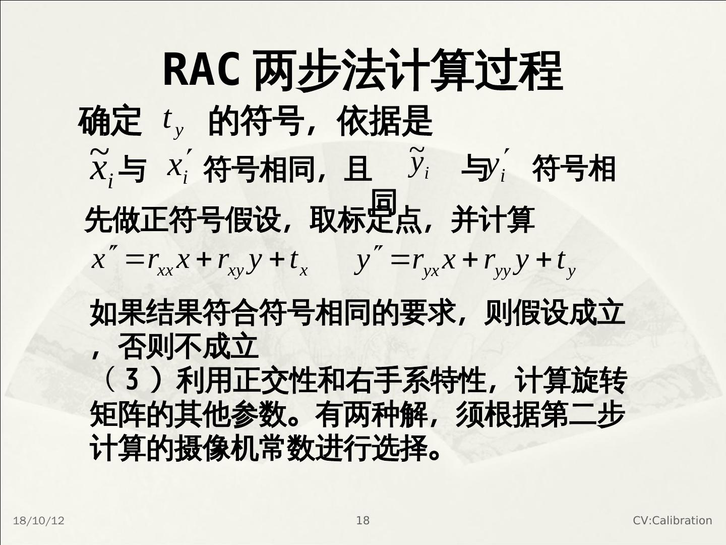 17 . RAC 两步法计算过程 第一步: ( 1 )根据标定点,形成方程组AU b rxx rxy ryx ryy t x 计算得到 u ( t , t , t , t , t ) y y y y y ai ( ~ y i xi , ~ y i y i , ~ xi xi , ~ xi y i , ~ yi ) b ( ~ x1 , ~ x 2 ,..., ~ xn ) ( 2 )利用旋转矩阵的正交性,得到 2U [U 2 4(u1u 4 u2u3 ) 2 ]1 2 t y 2(u1u 4 u 2u3 ) 2 U u12 u 22 u 32 u 42 18/10/12 17 CV:Calibration