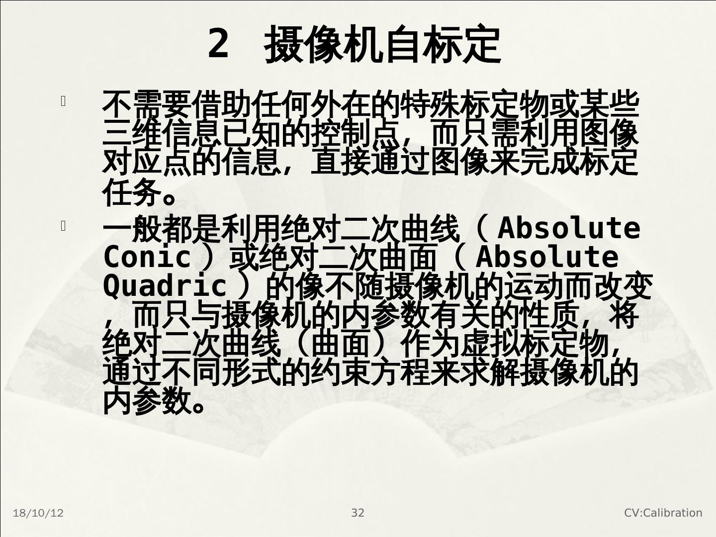 9 . 1. 传统的摄像机标定方法 优点 可以使用于任意的摄像机模型,标定精度高 不足 标定过程复杂,需要高精度的已知结构信息。 在实际应用中很多情况下无法使用标定块。 18/10/12 9 CV:Calibration