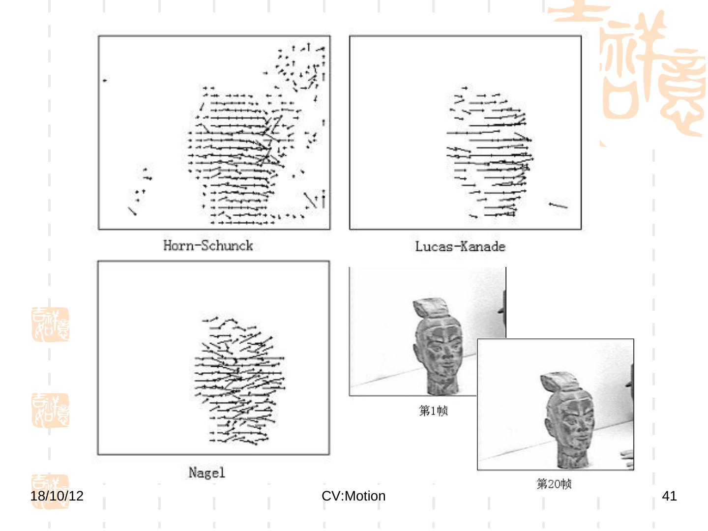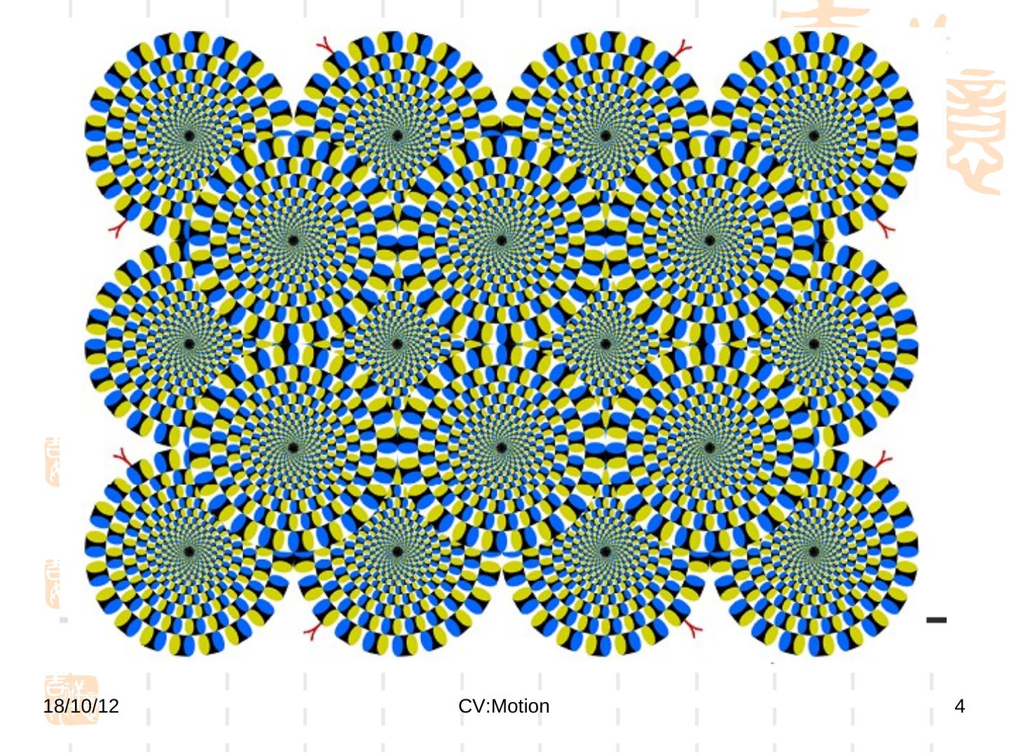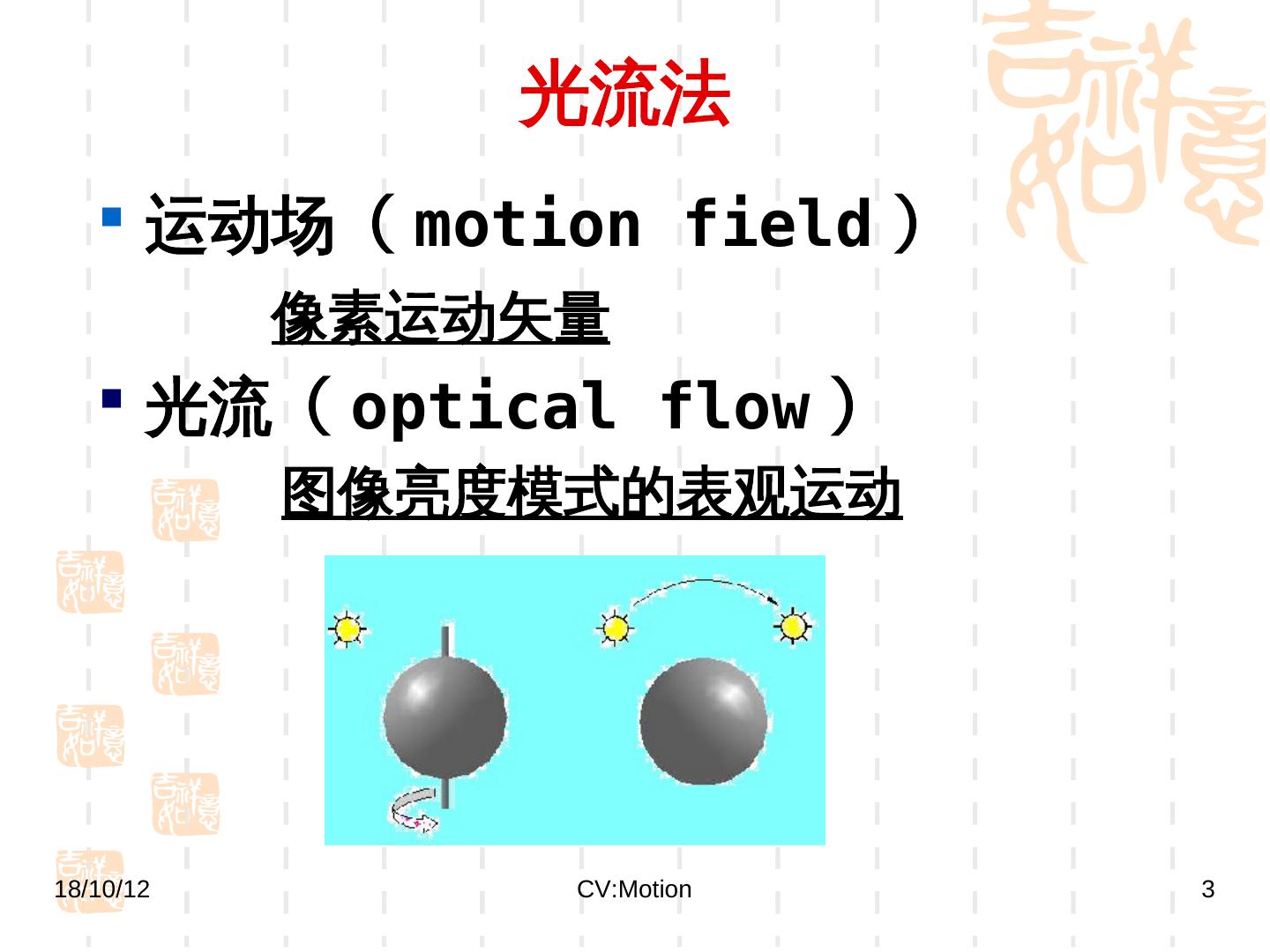 3 . 光流法 运动场( motion field ) 像素运动矢量 光流( optical flow ) 图像亮度模式的表观运动 18/10/12 CV:Motion 3