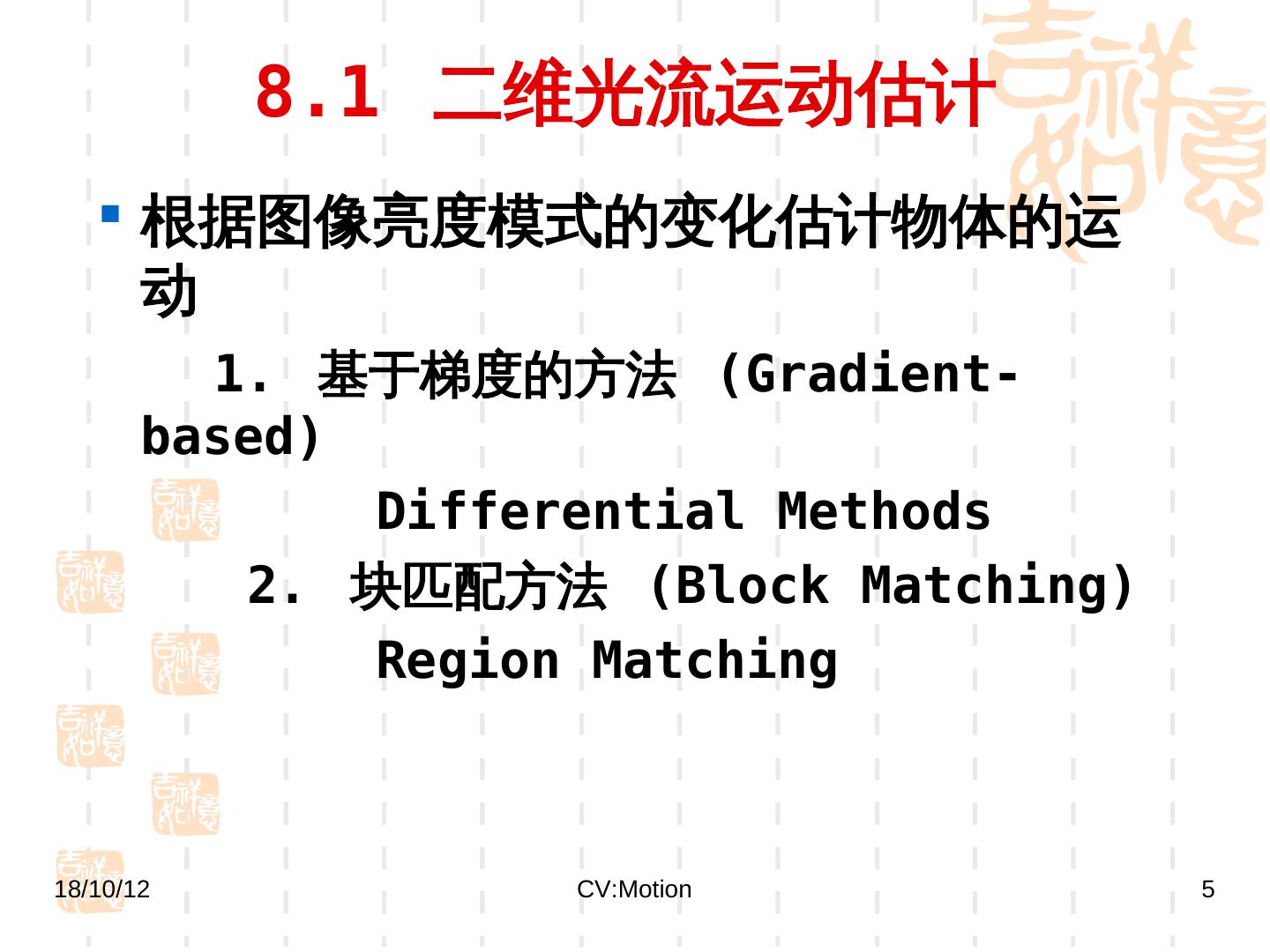 5 . 8.1 二维光流运动估计 根据图像亮度模式的变化估计物体的运 动 1. 基于梯度的方法 (Gradient-Gradient- based) Differential Methods 2. 块匹配方法 (Gradient-Block Matching)) Reg)ion Matching) 18/10/12 CV:Motion 5