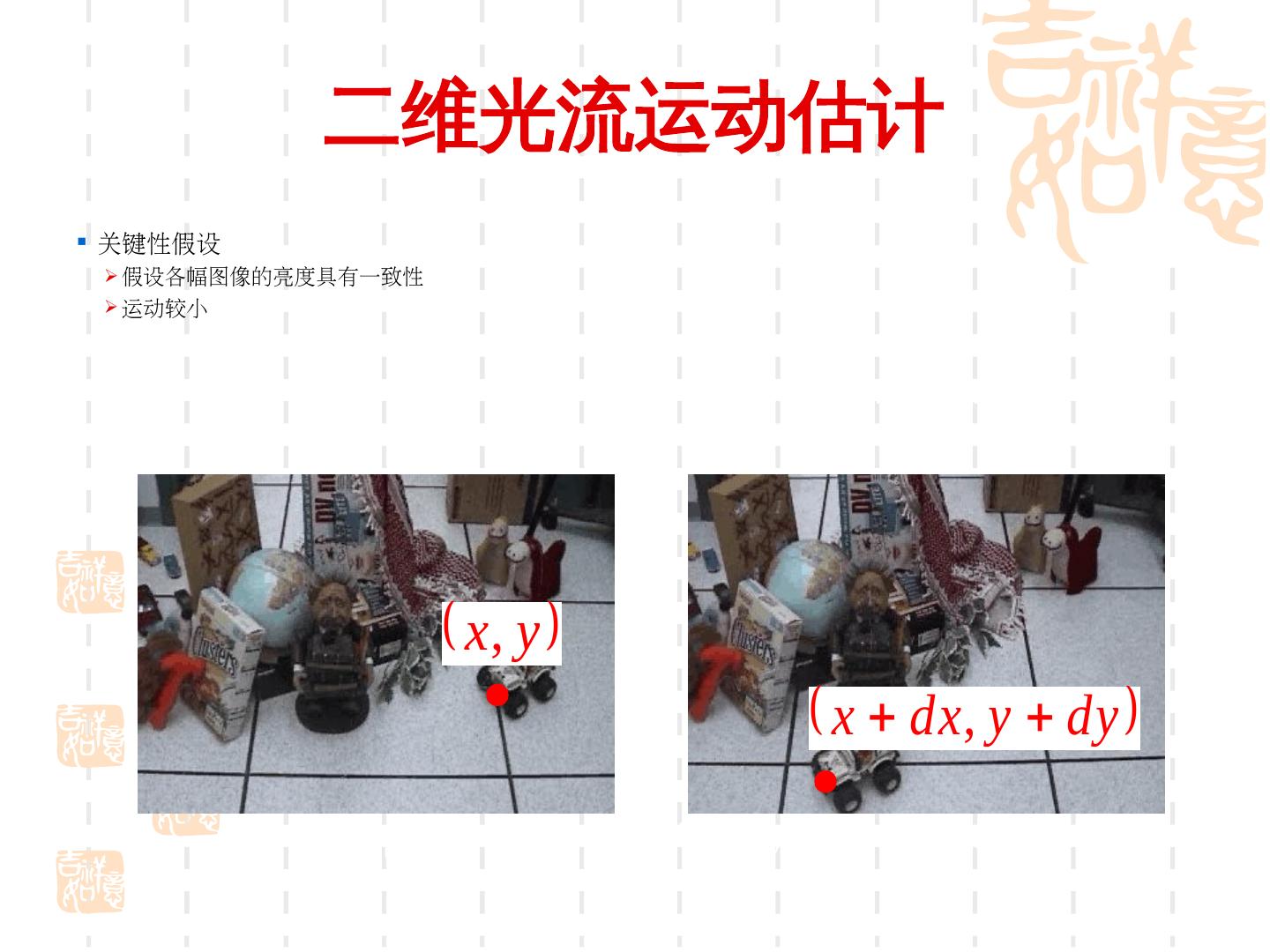 6 . 二维光流运动估计 关键性假设 假设各幅图像的亮度具有一致性 运动较小 Time = t Time = t+dt x, y x dx , y dy I 0 ( x , y , t ) I1 ( x x , y y , t t )