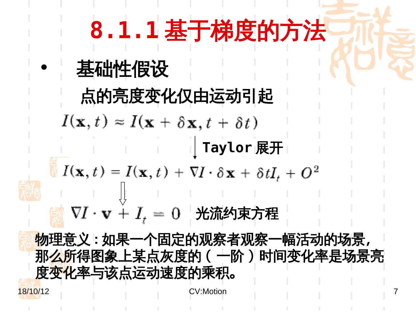 7 . 8.1.1 基于梯度的方法 • 基础性假设 点的亮度变化仅由运动引起 Taylor 展开 光流约束方程 物理意义 : 如果一个固定的观察者观察一幅活动的场景, 那么所得图象上某点灰度的 ( 一阶 ) 时间变化率是场景亮 度变化率与该点运动速度的乘积。 18/10/12 CV:Motion 7