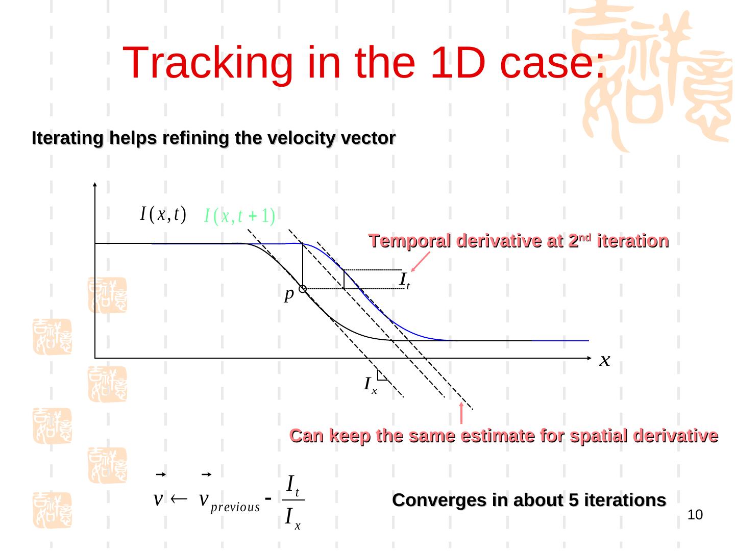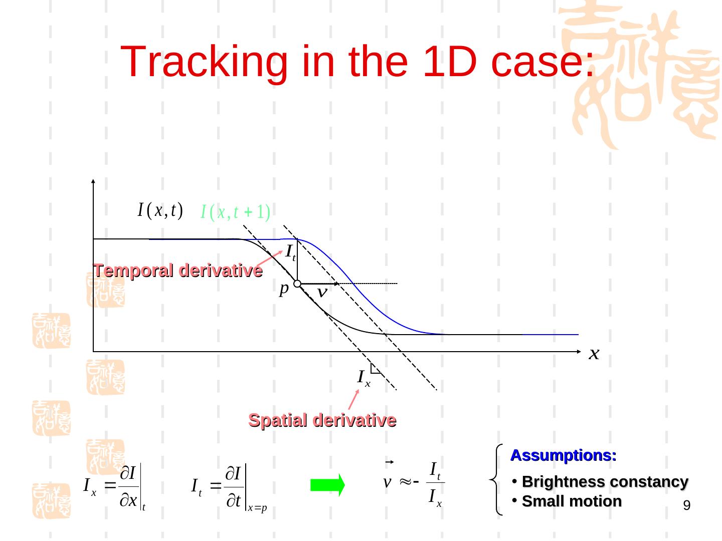 9 . Tracking in the 1D case: I ( x , t ) I ( x , t 1) It Temporal derivative p v x Ix Spatial derivative Assumptions: I I I Ix It v t • Brightness constancy x t t x p Ix • Small motion 9