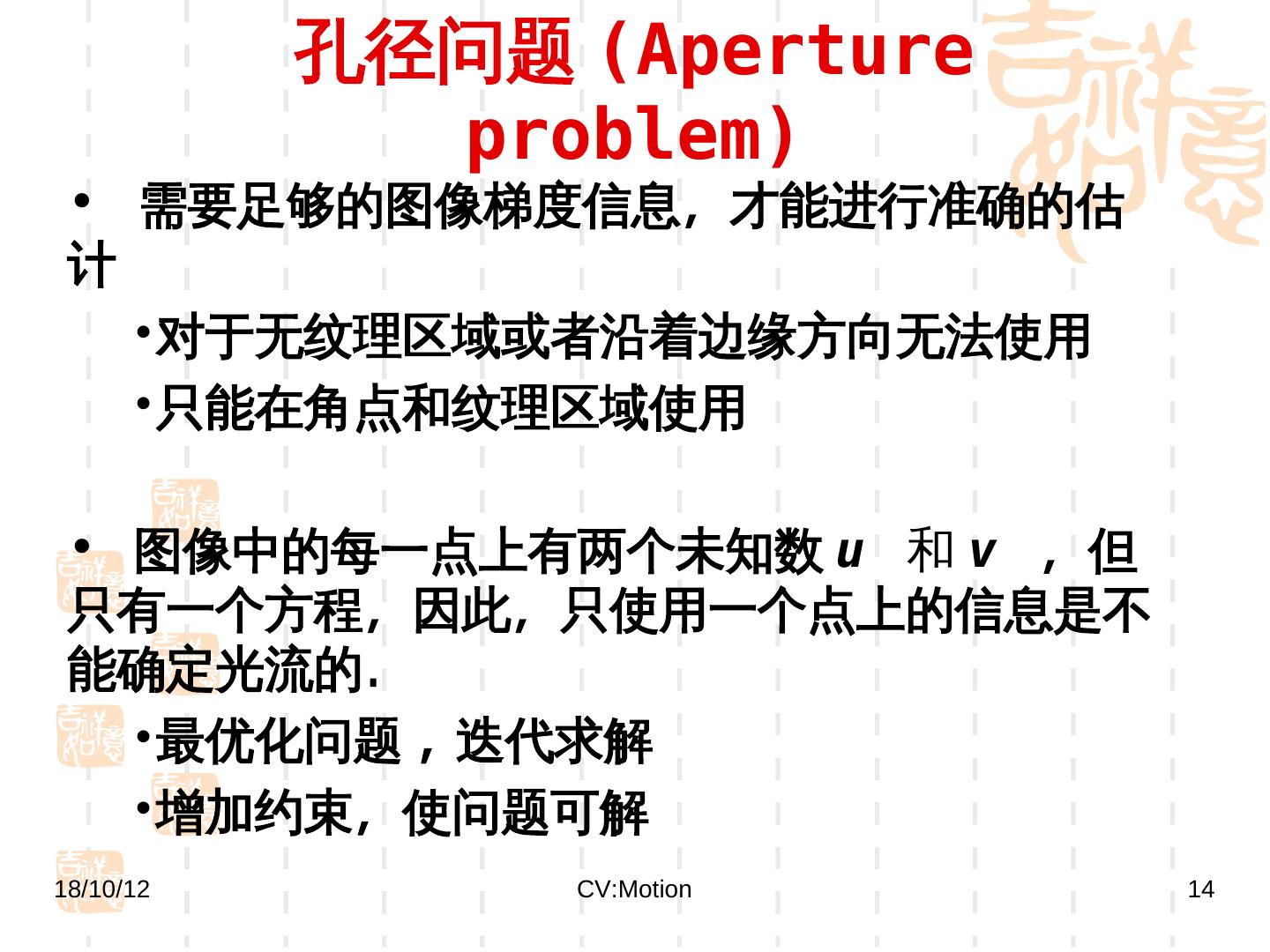 14 . 孔径问题 (Gradient-Aperture problem) • 需要足够的图像梯度信息,才能进行准确的估 计 •对于无纹理区域或者沿着边缘方向无法使用 •只能在角点和纹理区域使用 • 图像中的每一点上有两个未知数 u 和 v ,但 只有一个方程,因此,只使用一个点上的信息是不 能确定光流的. •最优化问题 , 迭代求解 •增加约束,使问题可解 18/10/12 CV:Motion 14