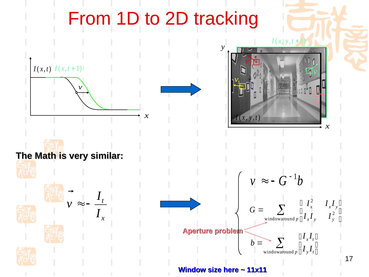 17 . From 1D to 2D tracking I ( x , y , t 1) y v2 I ( x , t ) I ( x , t 1) v3 v1 v v4 x I ( x, y, t) x The Math is very similar: v G 1b It v I x2 IxIy Ix G window around p I x I y I y2 Aperture problem I x It b window around p I y I t 17 Window) size here ~ 11x11