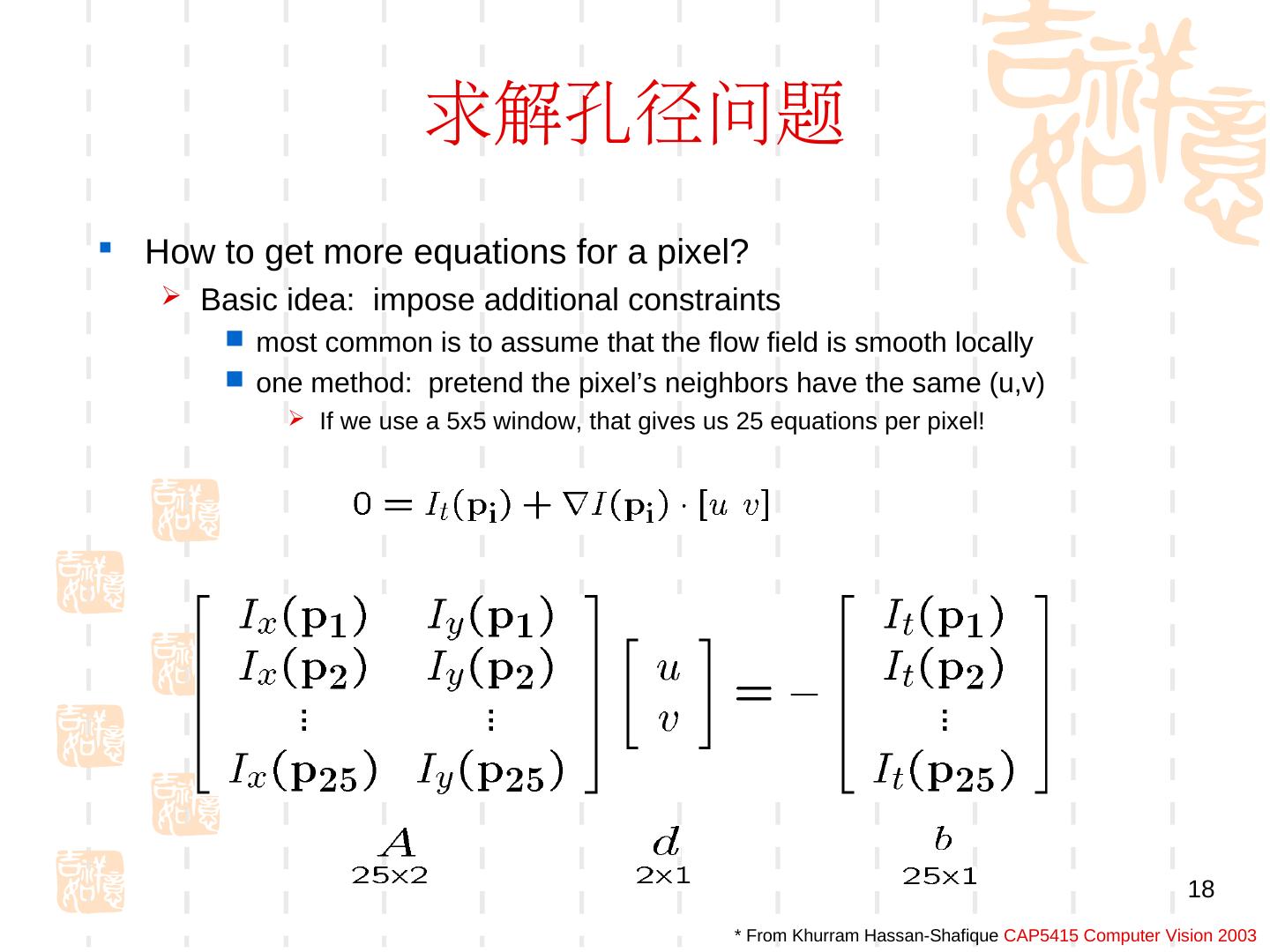 18 . 求解孔径问题 How to get more equations for a pixel? Basic idea: impose additional constraints most common is to assume that the flow field is smooth locally one method: pretend the pixel’s neighbors have the same (u,v) If we use a 5x5 window, that gives us 25 equations per pixel! 18 * From Khurram Hassan-Shafique CAP5415 Computer Vision 2003