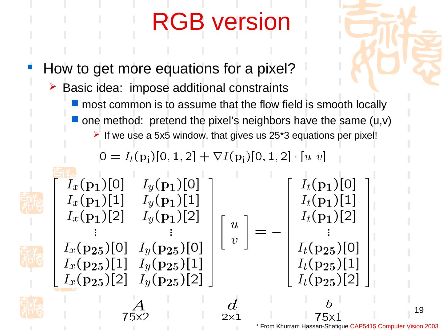19 . RGB version How to get more equations for a pixel? Basic idea: impose additional constraints most common is to assume that the flow field is smooth locally one method: pretend the pixel’s neighbors have the same (u,v) If we use a 5x5 window, that gives us 25*3 equations per pixel! 19 * From Khurram Hassan-Shafique CAP5415 Computer Vision 2003