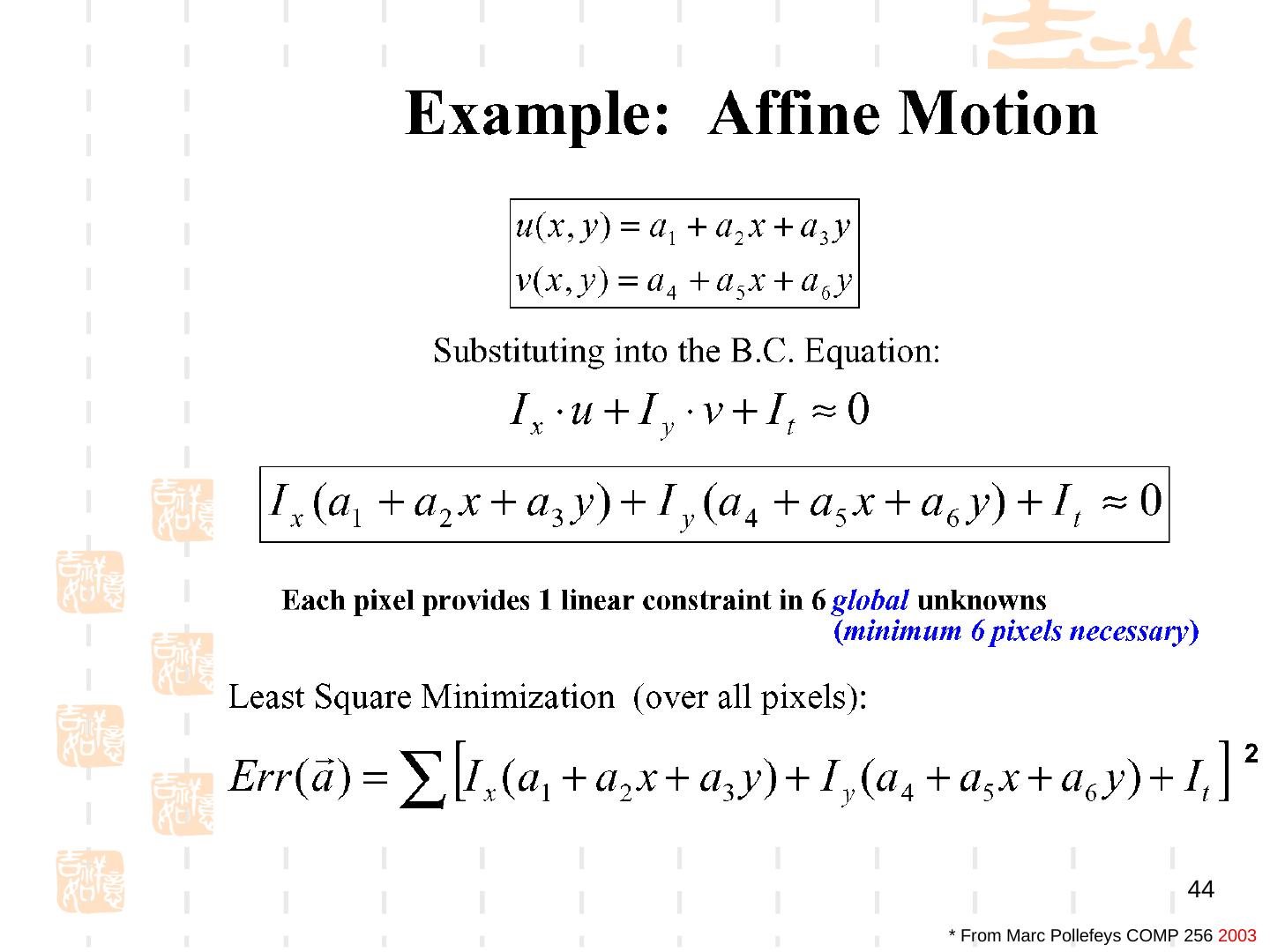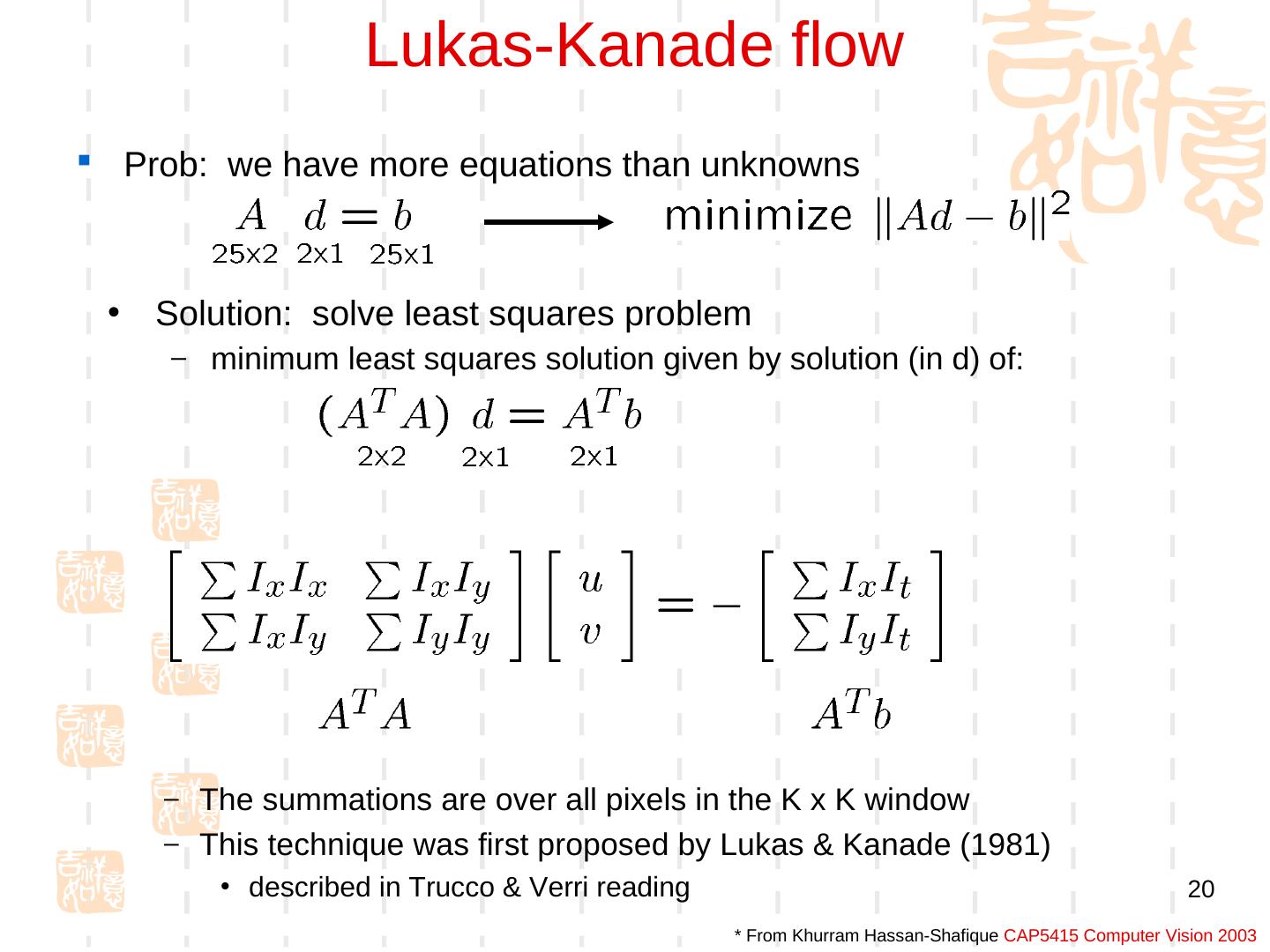 20 . Lukas-Kanade flow Prob: we have more equations than unknowns • Solution: solve least squares problem – minimum least squares solution given by solution (in d) of: – The summations are over all pixels in the K x K window – This technique was first proposed by Lukas & Kanade (1981) • described in Trucco & Verri reading 20 * From Khurram Hassan-Shafique CAP5415 Computer Vision 2003