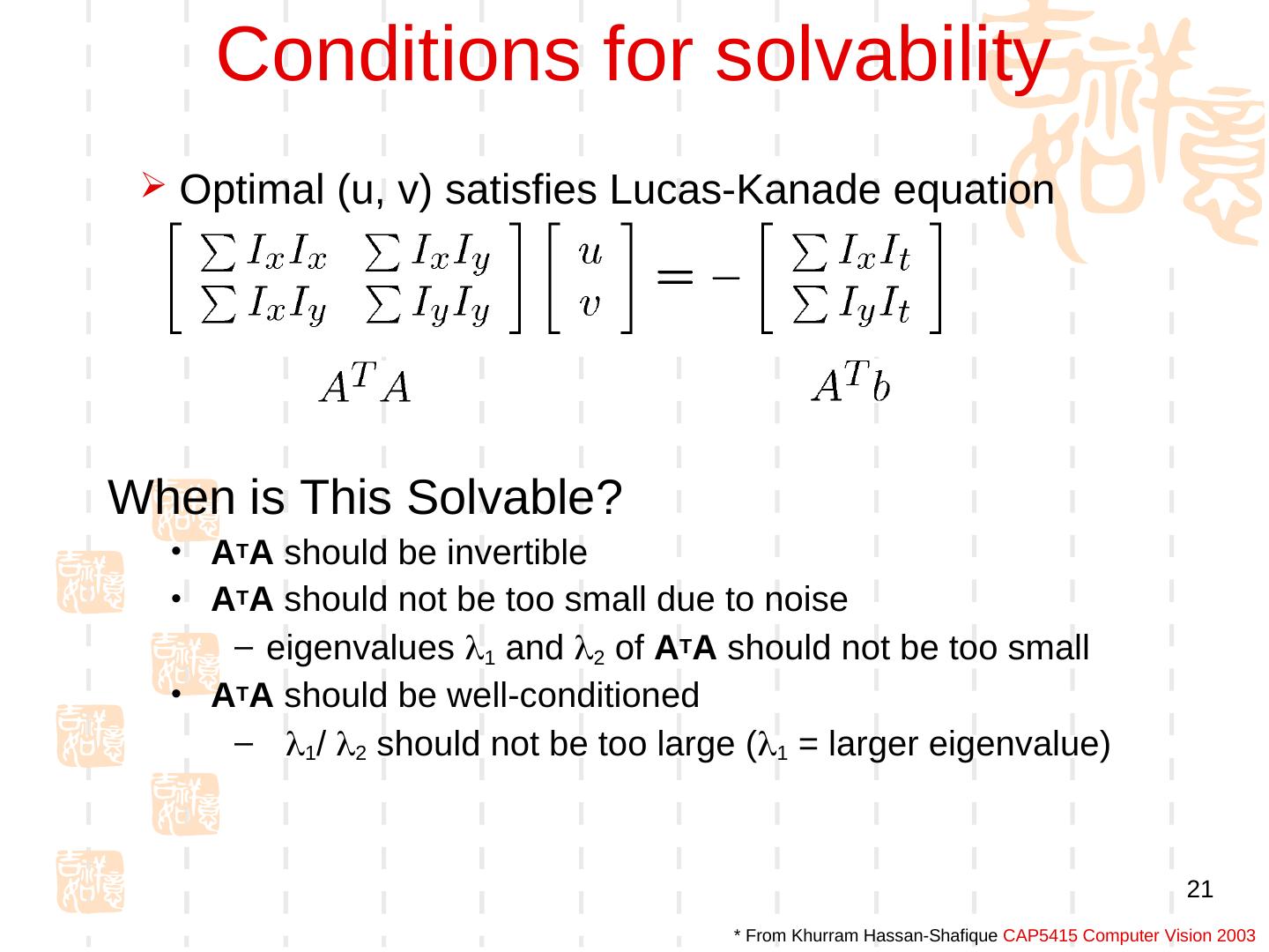 21 . Conditions for solvability Optimal (u, v) satisfies Lucas-Kanade equation When is This Solvable? • ATA should be invertible • ATA should not be too small due to noise – eigenvalues 1 and 2 of ATA should not be too small • ATA should be well-conditioned – 1/ 2 should not be too large (1 = larger eigenvalue) 21 * From Khurram Hassan-Shafique CAP5415 Computer Vision 2003