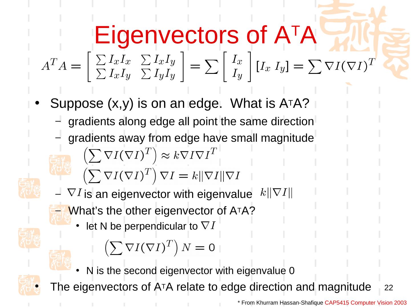 22 . Eigenvectors of A A T • Suppose (x,y) is on an edge. What is ATA? – gradients along edge all point the same direction – gradients away from edge have small magnitude – is an eigenvector with eigenvalue – What’s the other eigenvector of ATA? • let N be perpendicular to • N is the second eigenvector with eigenvalue 0 • The eigenvectors of ATA relate to edge direction and magnitude 22 * From Khurram Hassan-Shafique CAP5415 Computer Vision 2003