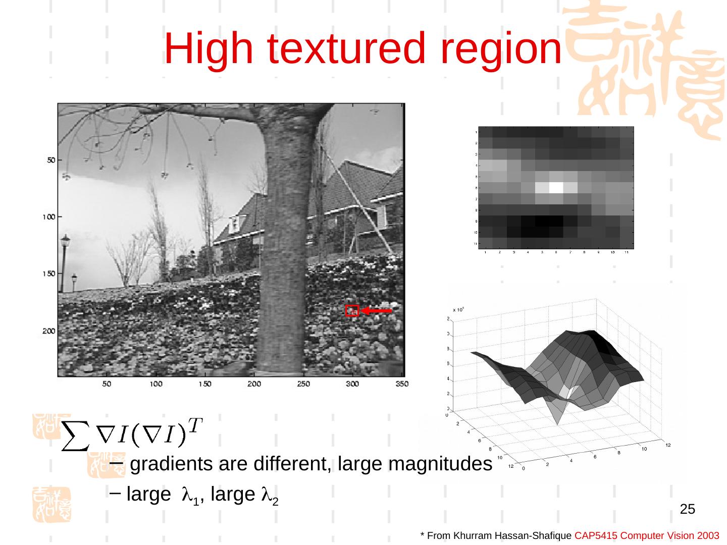 25 . High textured region – gradients are different, large magnitudes – large1, large 2 25 * From Khurram Hassan-Shafique CAP5415 Computer Vision 2003
