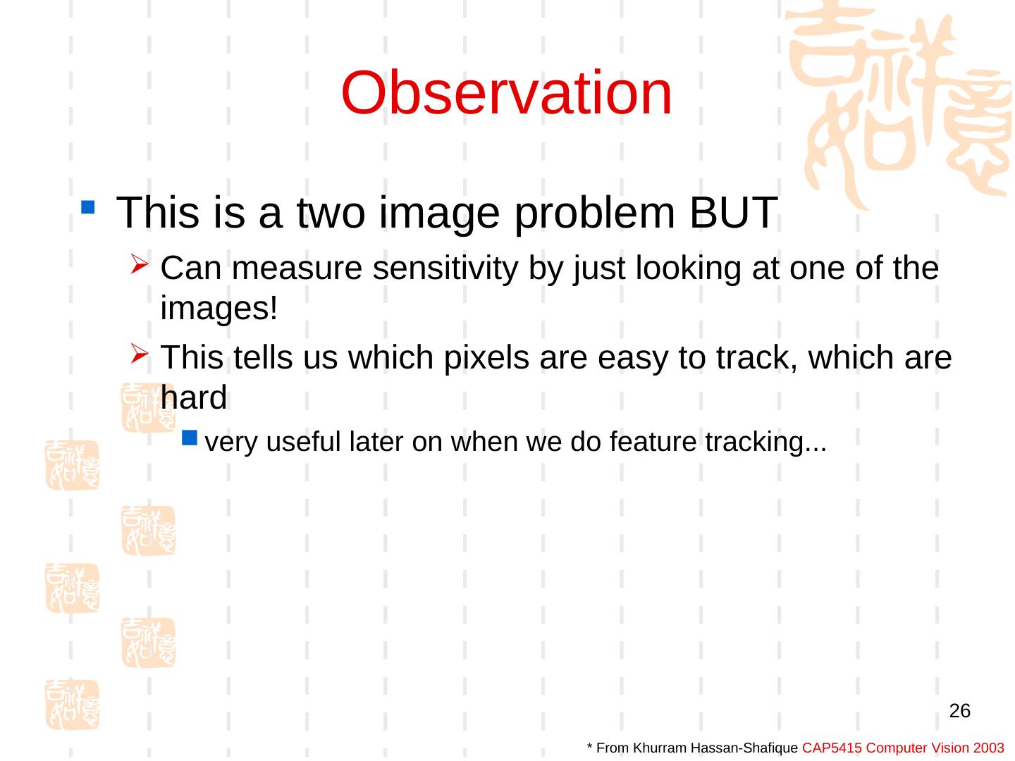 26 . Observation This is a two image problem BUT Can measure sensitivity by just looking at one of the images! This tells us which pixels are easy to track, which are hard very useful later on when we do feature tracking... 26 * From Khurram Hassan-Shafique CAP5415 Computer Vision 2003