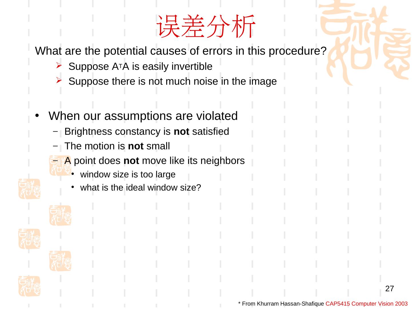 27 . 误差分析 What are the potential causes of errors in this procedure? Suppose ATA is easily invertible Suppose there is not much noise in the image • When our assumptions are violated – Brightness constancy is not satisfied – The motion is not small – A point does not move like its neighbors • window size is too large • what is the ideal window size? 27 * From Khurram Hassan-Shafique CAP5415 Computer Vision 2003
