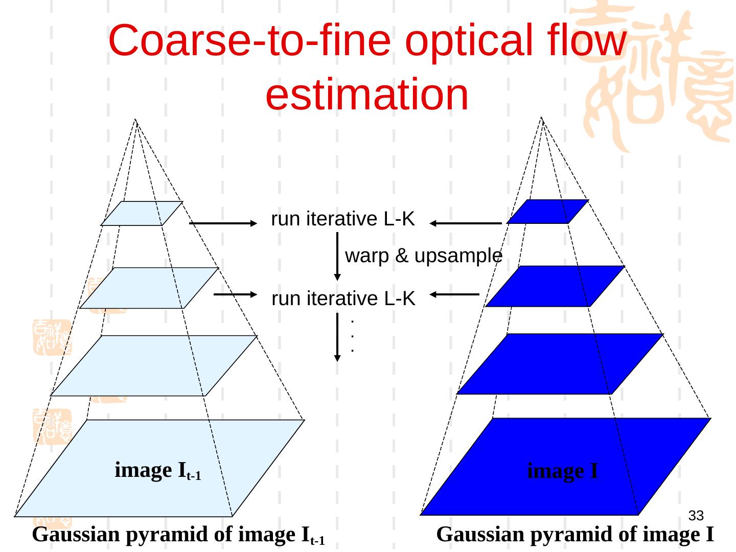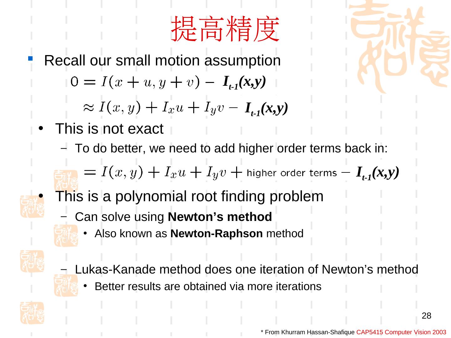 28 . 提高精度 Recall our small motion assumption It-1(x,y) It-1(x,y) • This is not exact – To do better, we need to add higher order terms back in: It-1(x,y) • This is a polynomial root finding problem – Can solve using New)ton’s method • Also known as New)ton-Raphson method – Lukas-Kanade method does one iteration of Newton’s method • Better results are obtained via more iterations 28 * From Khurram Hassan-Shafique CAP5415 Computer Vision 2003