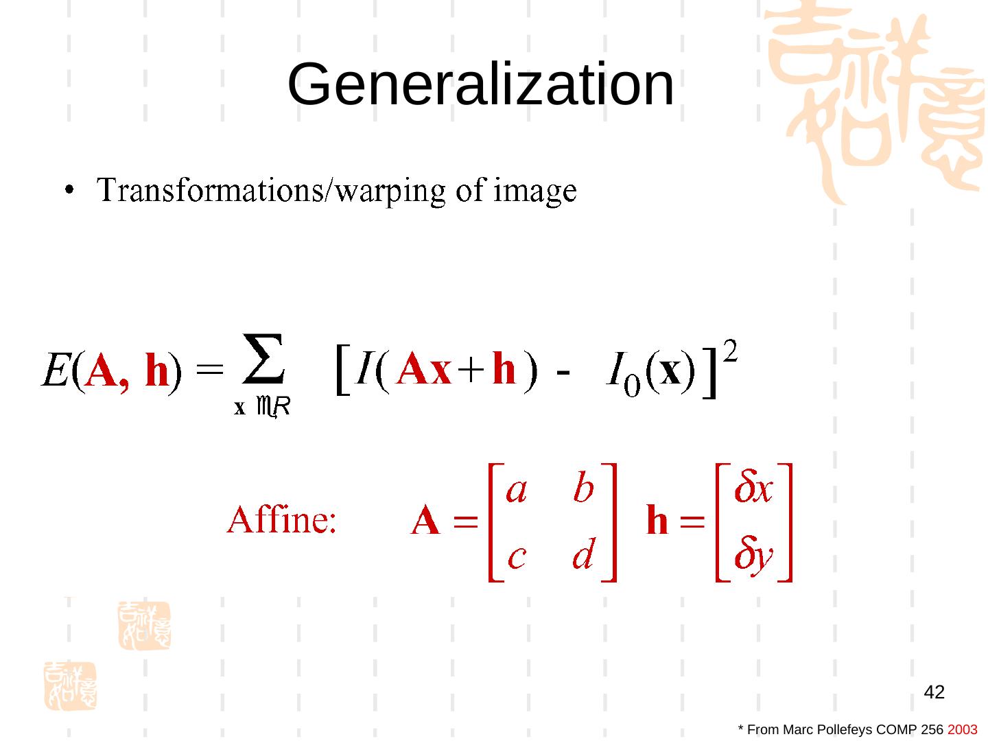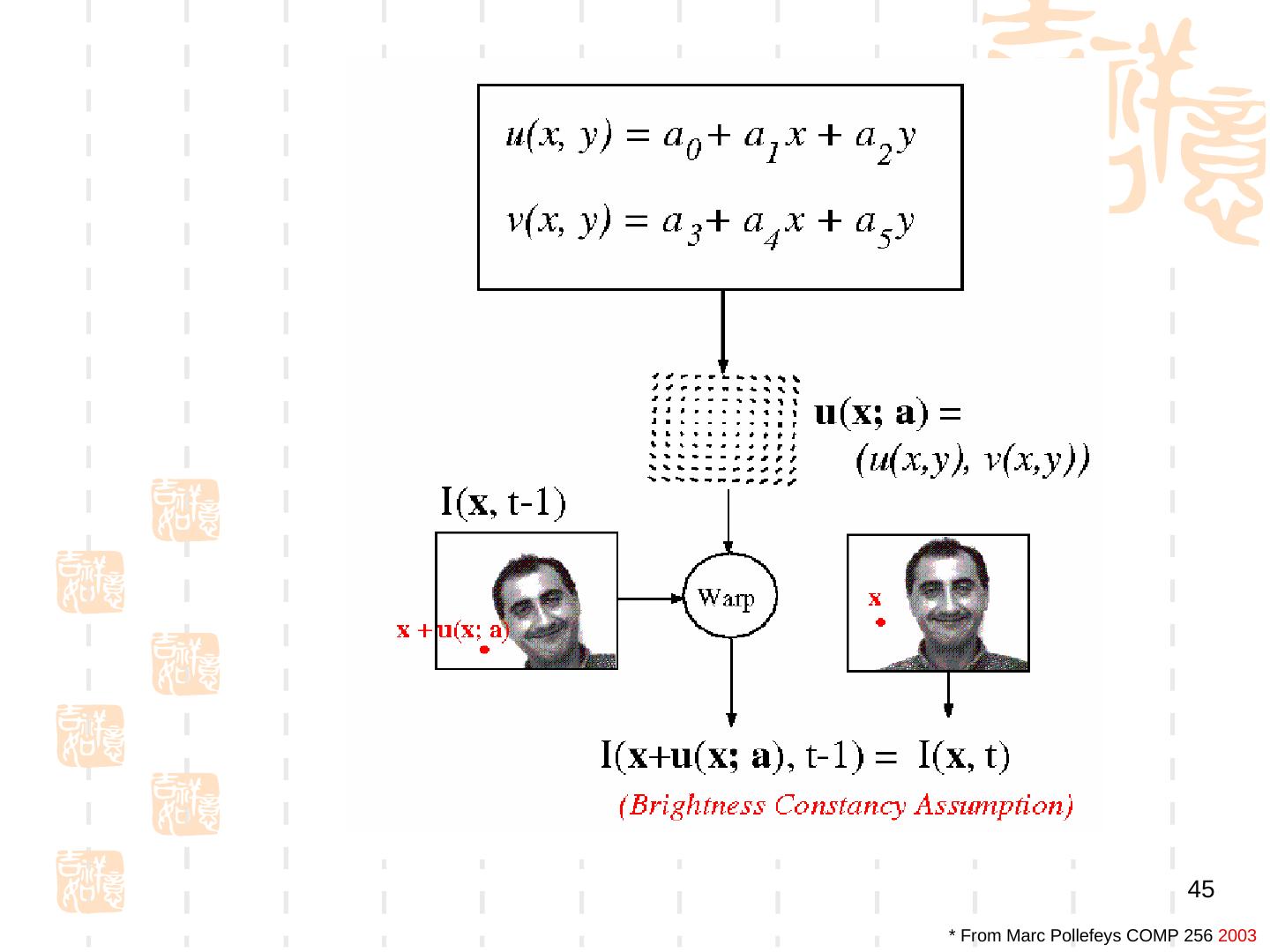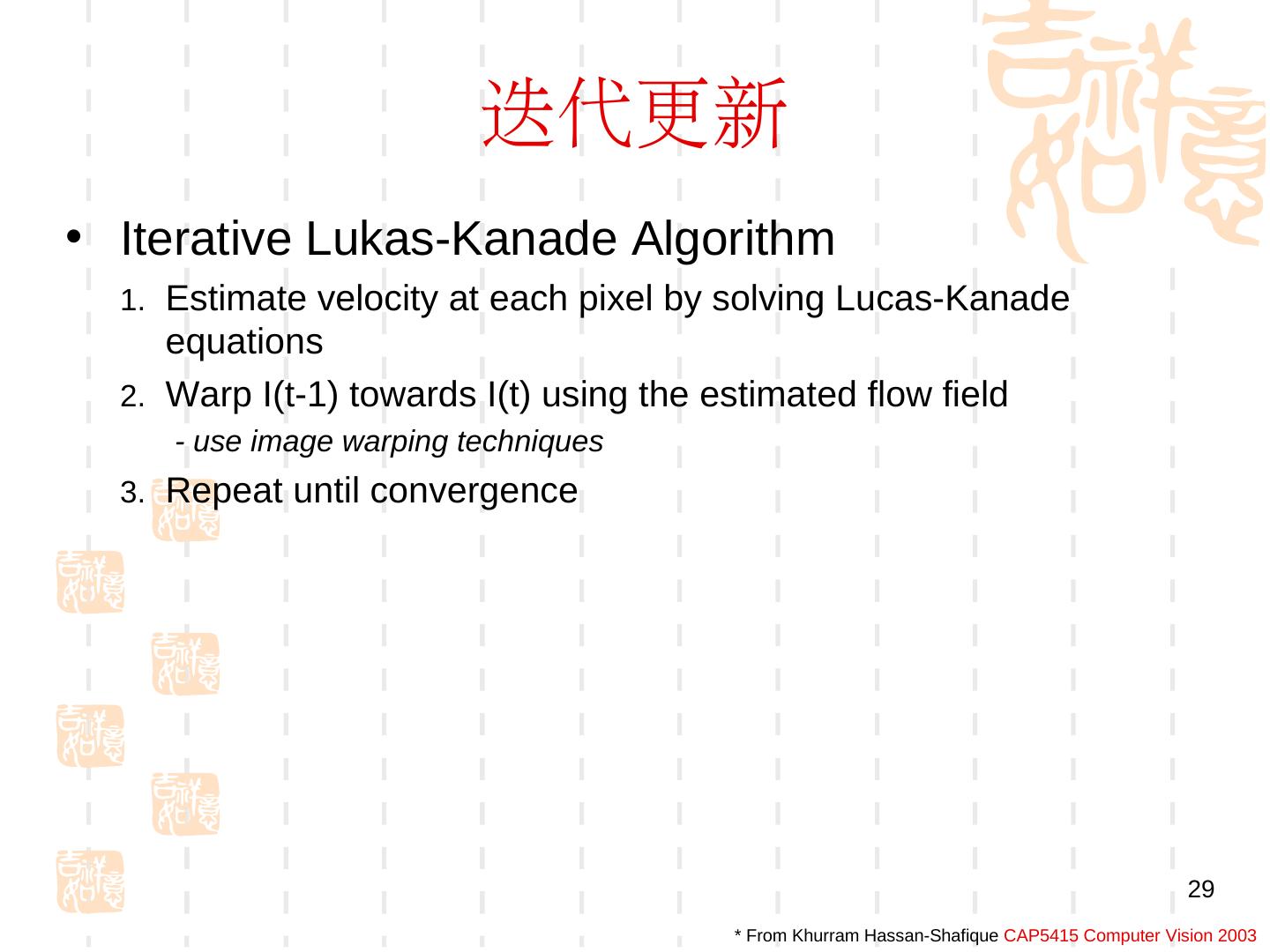 29 . 迭代更新 • Iterative Lukas-Kanade Algorithm 1. Estimate velocity at each pixel by solving Lucas-Kanade equations 2. Warp I(t-1) towards I(t) using the estimated flow field - use image warping techniques 3. Repeat until convergence 29 * From Khurram Hassan-Shafique CAP5415 Computer Vision 2003