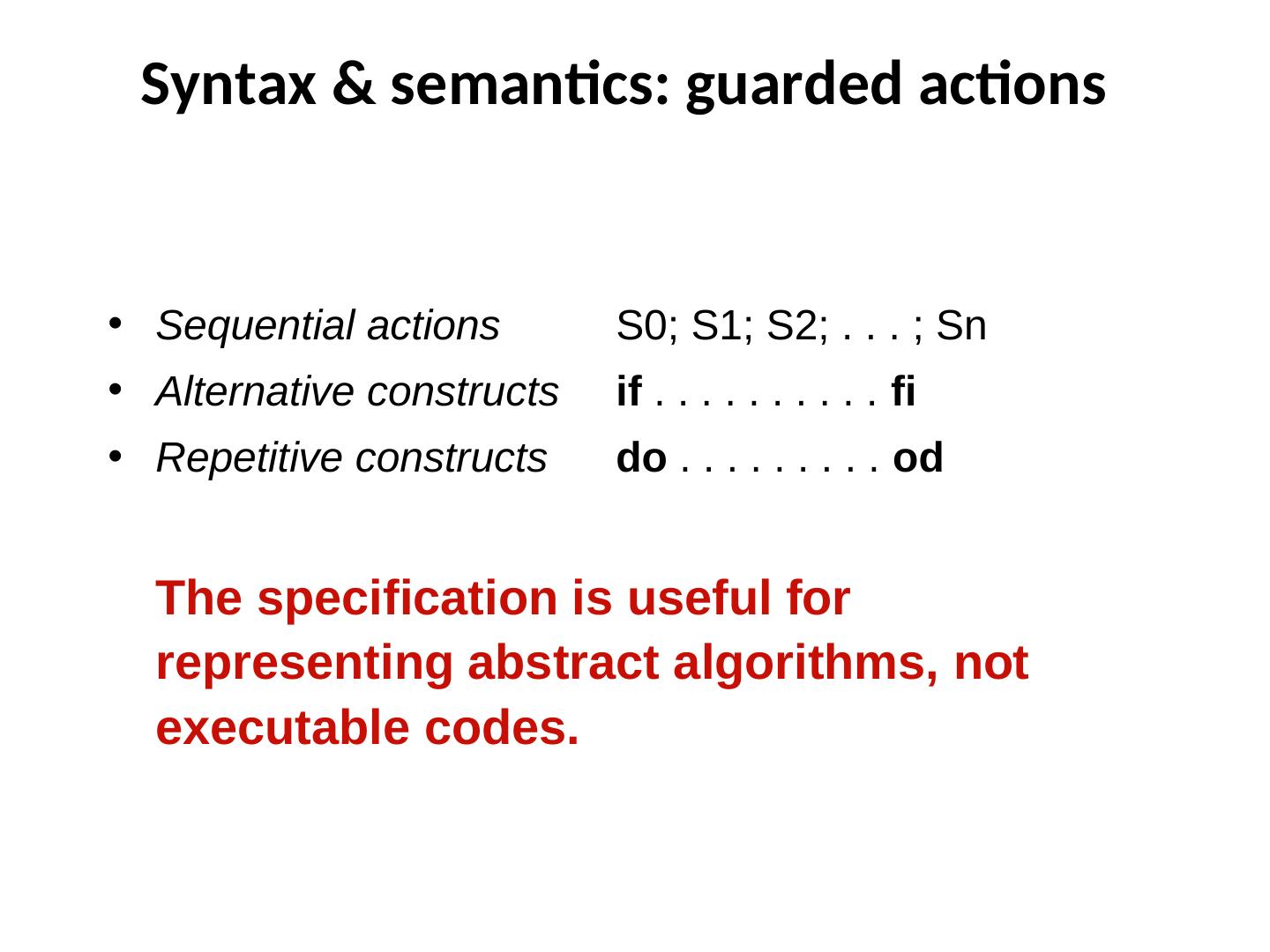 3 . Syntax & semantics: guarded actions <guard G> <action A>> is equivalent to if G then A> (Borrowed from E.W. Dijkstra: A Discipline of Programming)