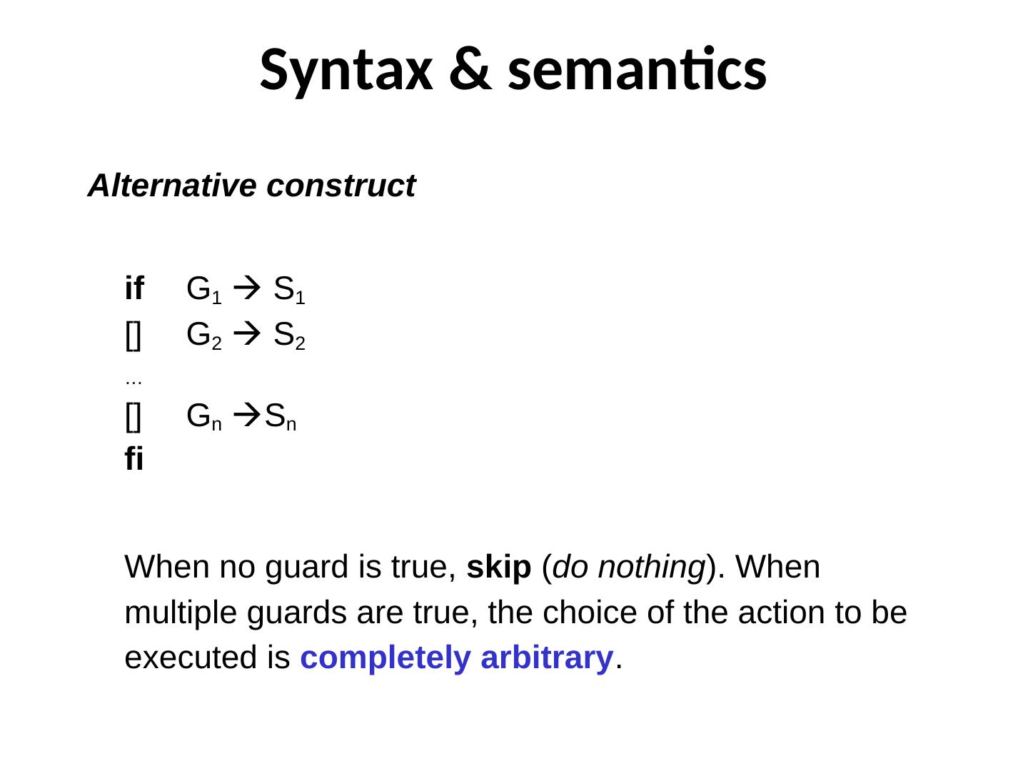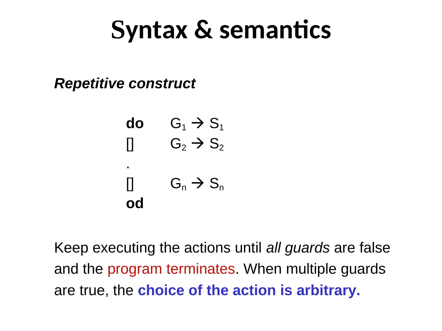 6 . Syntax & semantics Repetitive construct do G1 S1 [] G2 S2 . [] Gn Sn od Keep executing the actions until all guards are false and the program terminates. When multiple guards are true, the choice of the action is arbitrary.