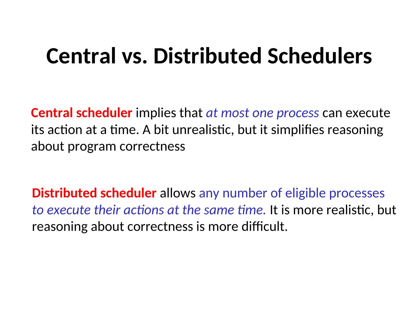 8 . Central vs. Distributed Schedulers Central scheduler implies that at most one process can execute its action at a time. A bit unrealistic, but it simplifies reasoning about program correctness Distributed scheduler allows any number of eligible processes to execute their actions at the same time. It is more realistic, but reasoning about correctness is more difficult.