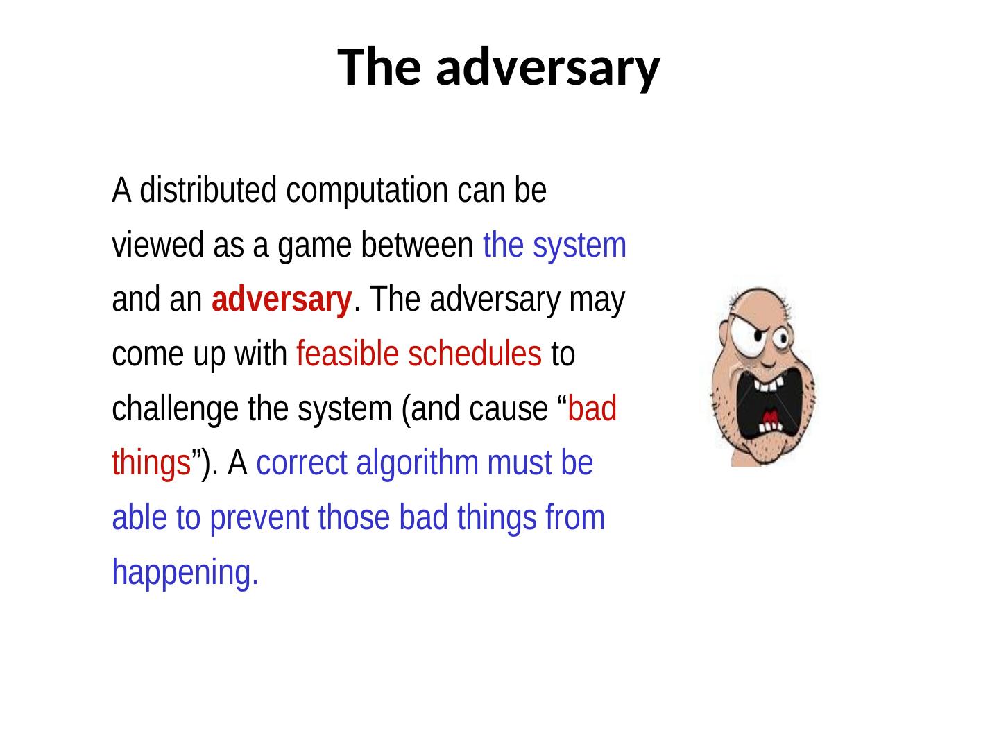 10 . The adversary A distributed computation can be viewed as a game between the system and an adversary. The adversary may come up with feasible schedules to challenge the system (and cause “bad things”). A correct algorithm must be able to prevent those bad things from happening.