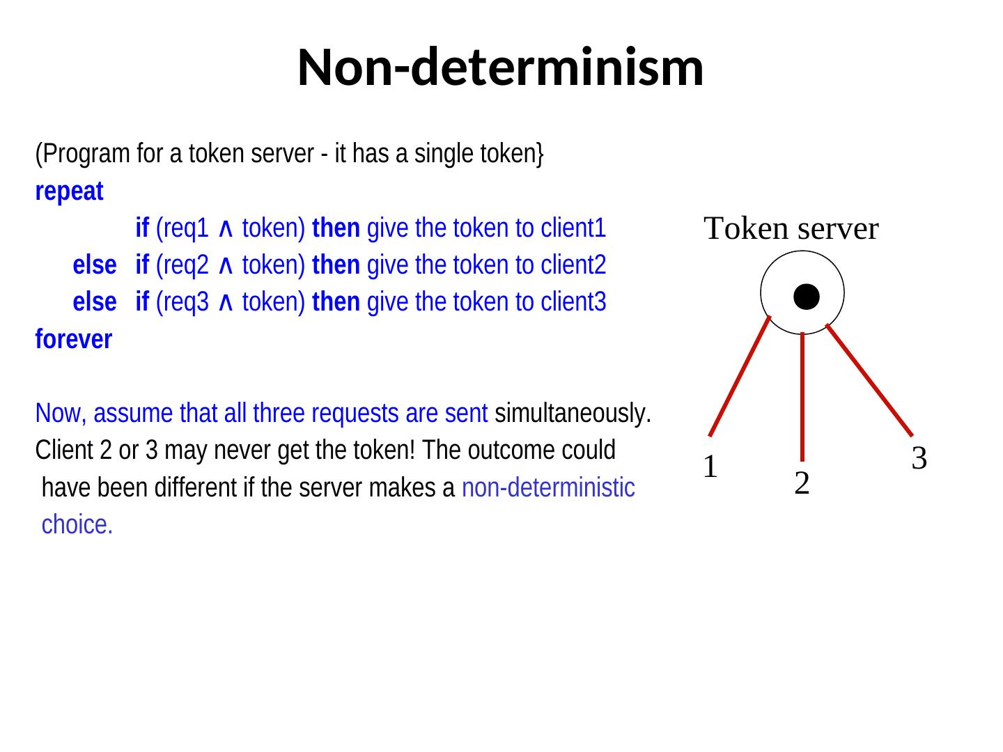 11 . Non-determinism (Program for a token server - it has a single token} repeat if (req1 ∧ token) token) then give the token to client1 Token server else if (req2 ∧ token) token) then give the token to client2 else if (req3 ∧ token) token) then give the token to client3 forever Now, assume that all three requests are sent simultaneously. Client 2 or 3 may never get the token! The outcome could 3 1 have been different if the server makes a non-deterministic 2 choice.