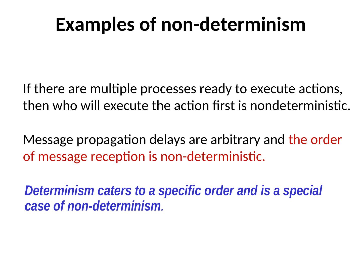 12 . Examples of non-determinism If there are multiple processes ready to execute actions, then who will execute the action first is nondeterministic. Message propagation delays are arbitrary and the order of message reception is non-deterministic. Determinism caters to a specific order and is a special case of non-determinism.