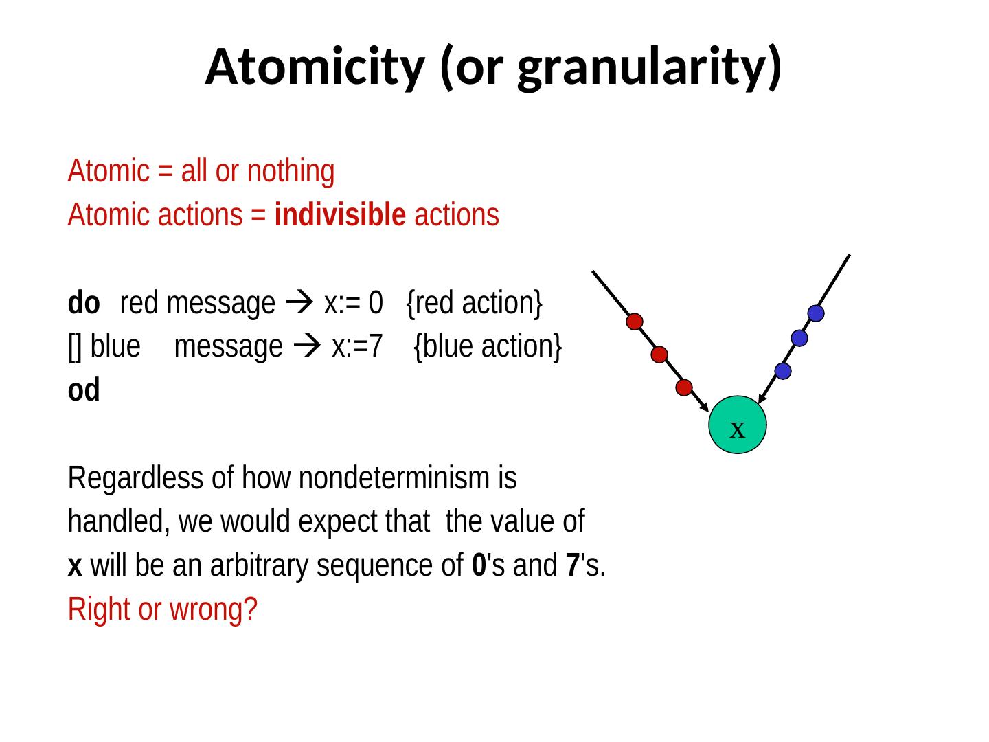 13 . Atomicity (or granularity) Atomic = all or nothing Atomic actions = indivisible actions do red message x:= 0 {red action} [] blue message x:=7 {blue action} od x Regardless of how nondeterminism is handled, we would expect that the value of x will be an arbitrary sequence of 0's and 7's. Right or wrong?