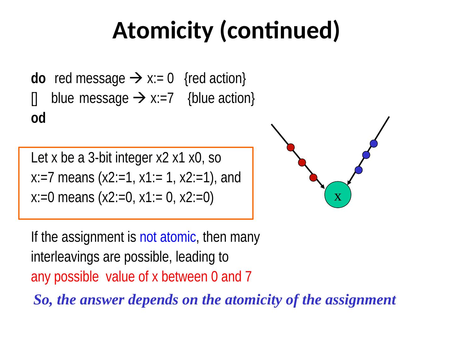 14 . Atomicity (continued) do red message x:= 0 {red action} [] blue message x:=7 {blue action} od Let x be a 3-bit integer x2 x1 x0, so x:=7 means (x2:=1, x1:= 1, x2:=1), and x:=0 means (x2:=0, x1:= 0, x2:=0) x If the assignment is not atomic, then many interleavings are possible, leading to any possible value of x between 0 and 7 So, the answer depends on the atomicity of the assignment