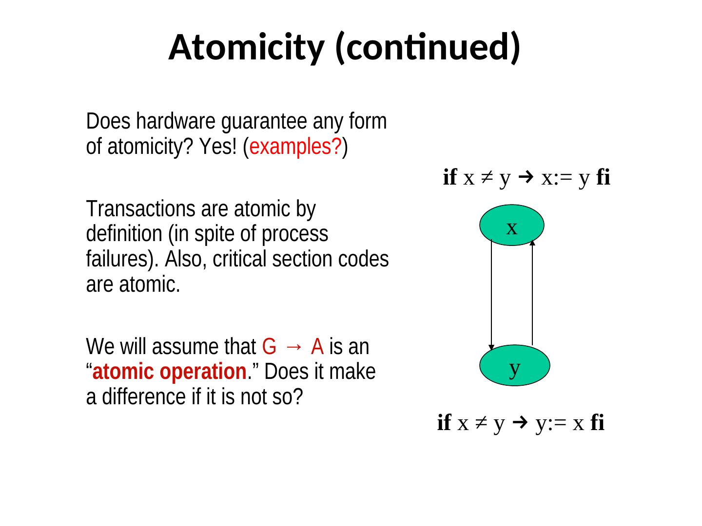 15 . Atomicity (continued) Does hardware guarantee any form of atomicity? Yes! (examples?) if x ≠ y → x:= y fi Transactions are atomic by definition (in spite of process x failures). Also, critical section codes are atomic. We will assume that G → A is an “atomic operation.” Does it make y a difference if it is not so? if x ≠ y → y:= x fi