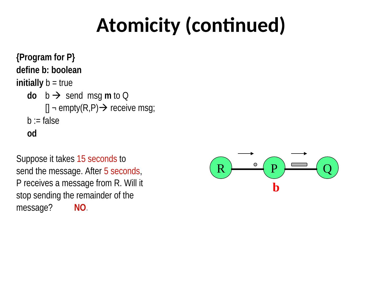 16 . Atomicity (continued) {Program for P} define b: boolean initially b = true do b send msg m to Q [] ¬ empty(R,P) receive msg; b := false od Suppose it takes 15 seconds to send the message. After 5 seconds, R P Q P receives a message from R. Will it b stop sending the remainder of the message? NO.