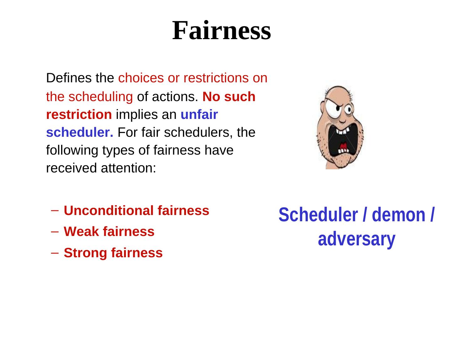 17 . Fairness Defines the choices or restrictions on the scheduling of actions. No such restriction implies an unfair scheduler. For fair schedulers, the following types of fairness have received attention: – Unconditional fairness Scheduler / demon / – Weak fairness adversary – Strong fairness