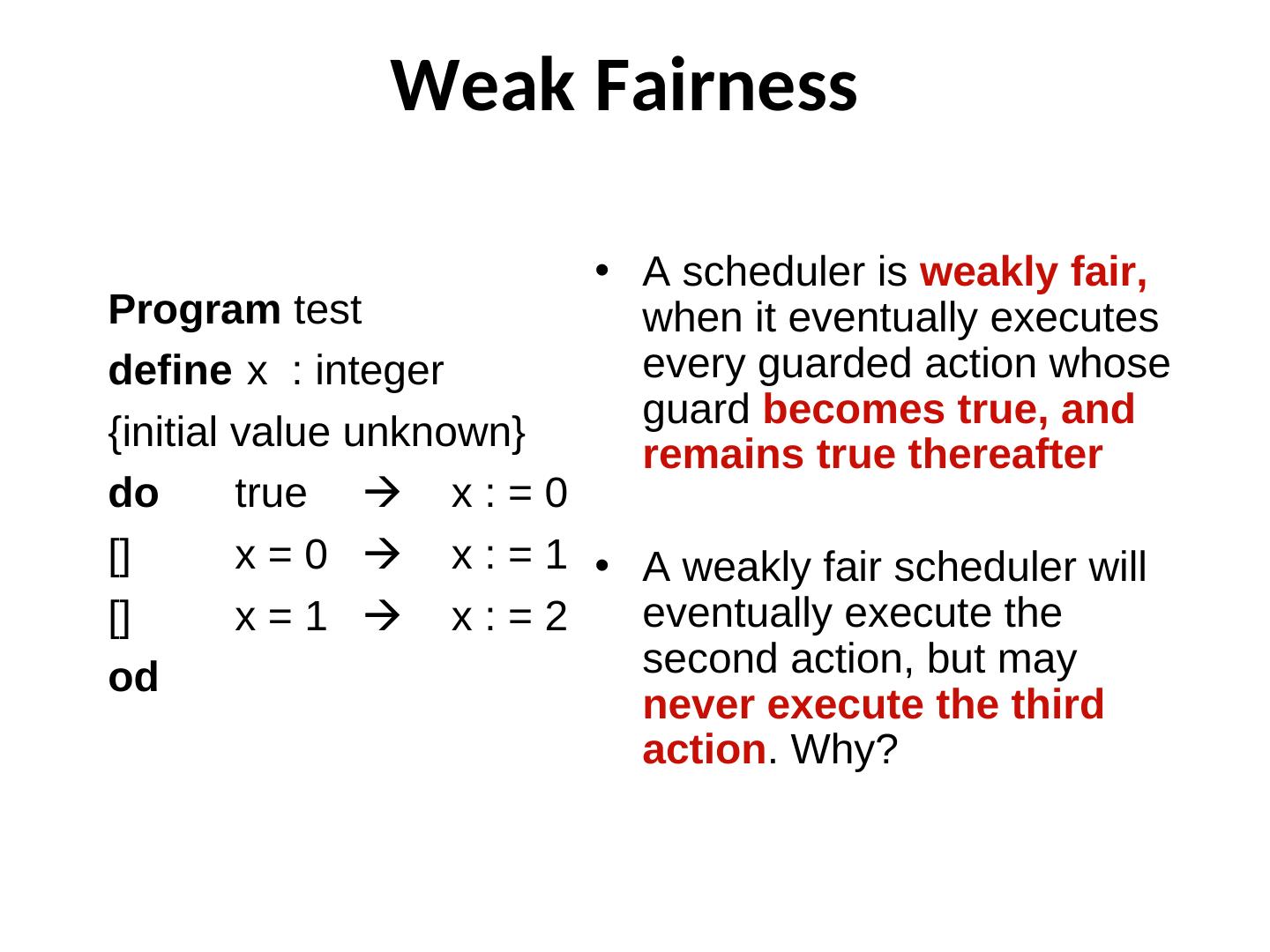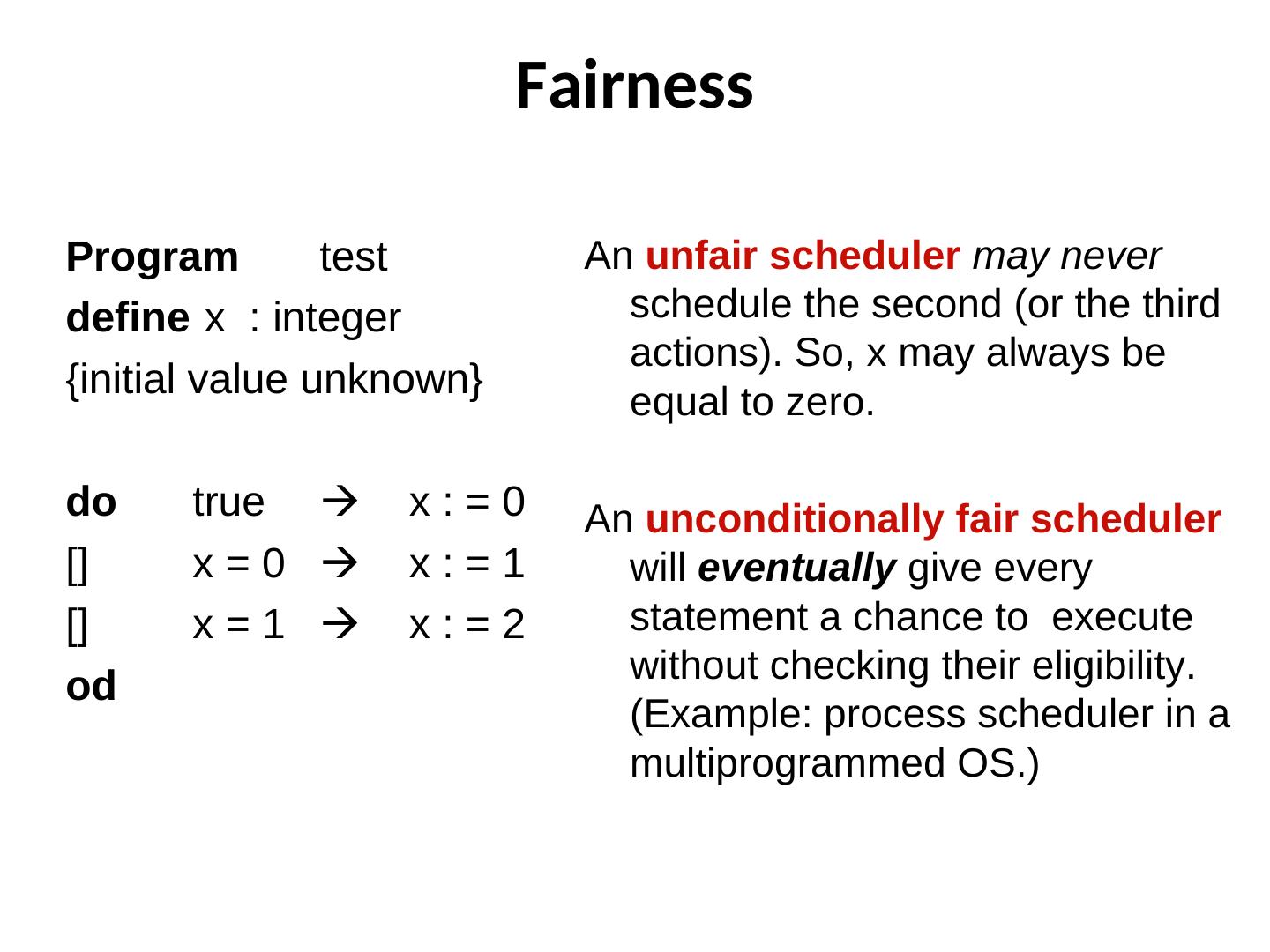 18 . Fairness Program test An unfair scheduler may never define x : integer schedule the second (or the third actions). So, x may always be {initial value unknown} equal to zero. do true x:=0 An unconditionally fair scheduler [] x=0 x:=1 will eventually give every [] x=1 x:=2 statement a chance to execute without checking their eligibility. od (Example: process scheduler in a multiprogrammed OS.)