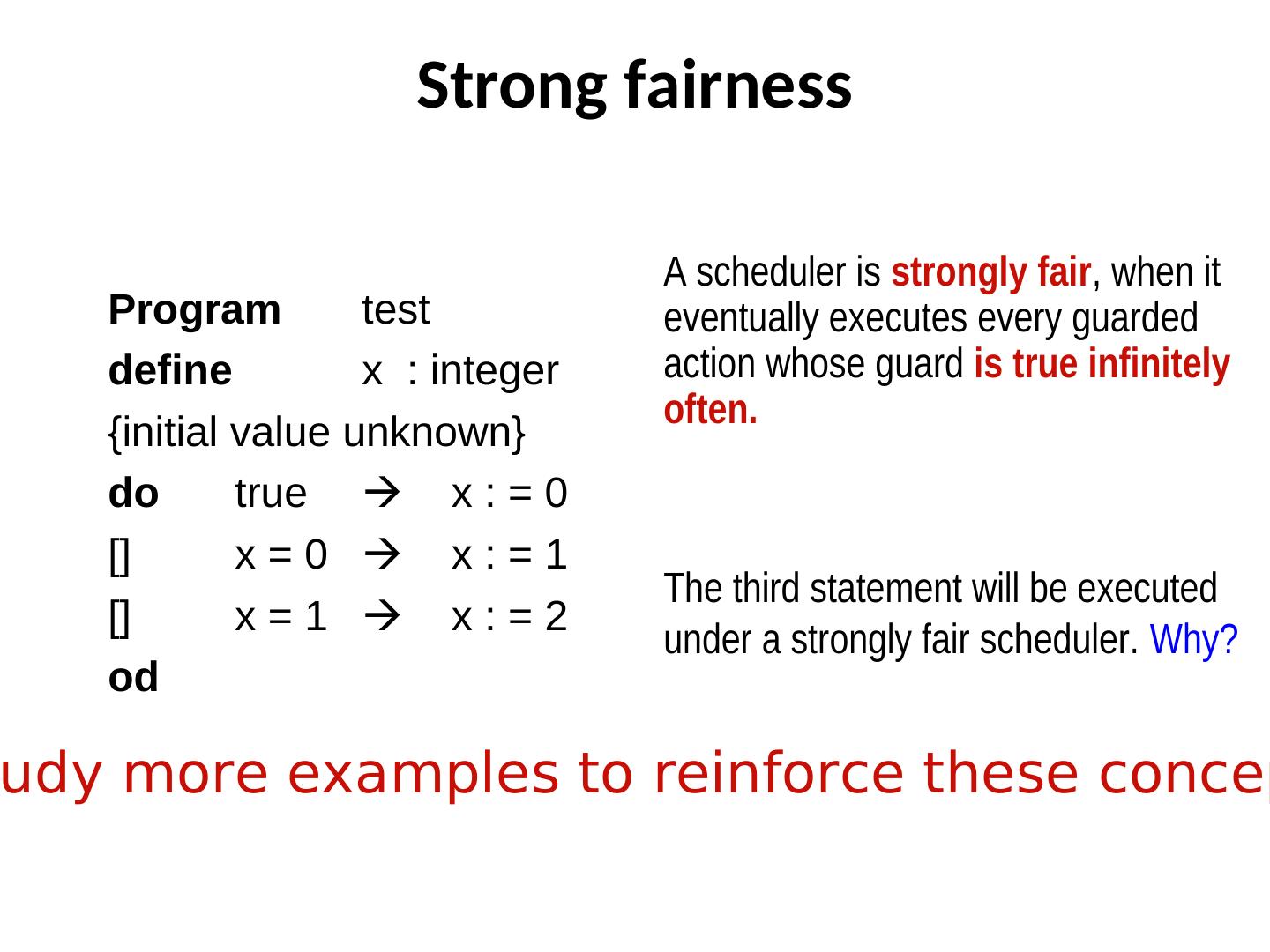 20 . Strong fairness A scheduler is strongly fair, when it Program test eventually executes every guarded define x : integer action whose guard is true infinitely often. {initial value unknown} do true x : = 0 [] x=0 x:=1 The third statement will be executed [] x=1 x:=2 under a strongly fair scheduler. Why? od udy more examples to reinforce these concep