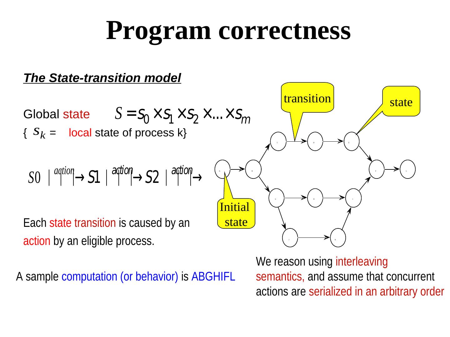 21 . Program correctness The State-transition model transition state Global state S =s0 ×s1 ×s2 ×...×sm { sk = local state of process k} C D E action action action S0 ⏐⏐⏐→ S1⏐⏐⏐→ S2 ⏐⏐⏐→ A B F L G H I Initial Each state transition is caused by an state action by an eligible process. J K We reason using interleaving A sample computation (or behavior) is ABGHIFL semantics, and assume that concurrent actions are serialized in an arbitrary order