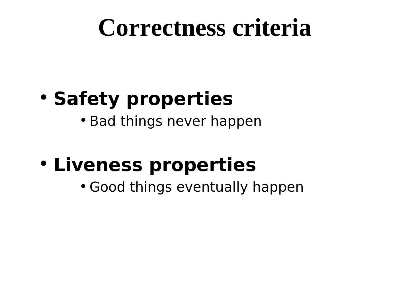 22 . Correctness criteria • Safety properties • Bad things never happen • Liveness properties • Good things eventually happen