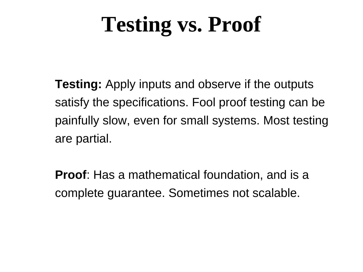 23 . Testing vs. Proof Testing: Apply inputs and observe if the outputs satisfy the specifications. Fool proof testing can be painfully slow, even for small systems. Most testing are partial. Proof: Has a mathematical foundation, and is a complete guarantee. Sometimes not scalable.