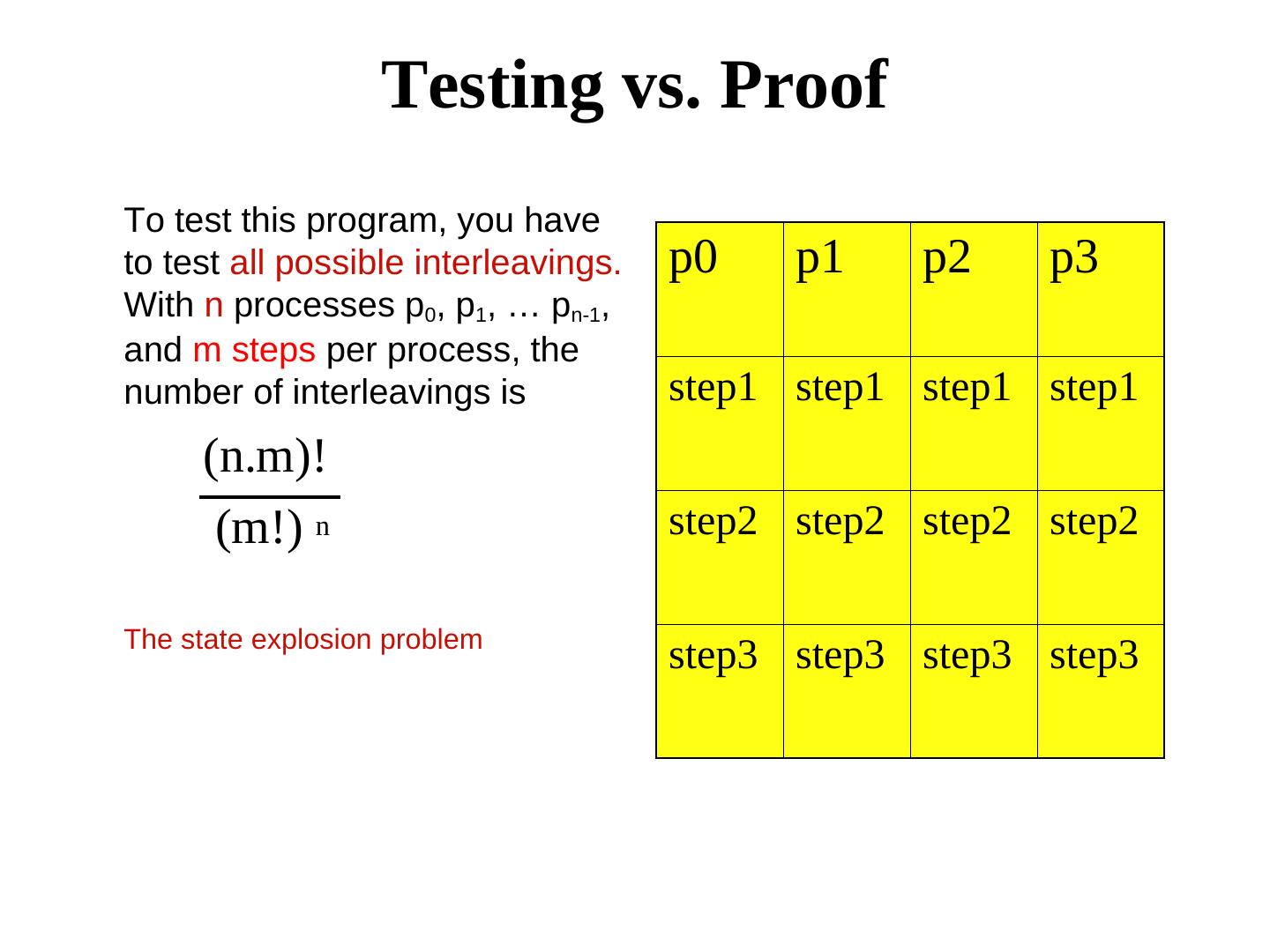 24 . Testing vs. Proof To test this program, you have to test all possible interleavings. p0 p1 p2 p3 With n processes p0, p1, … pn-1, and m steps per process, the number of interleavings is step1 step1 step1 step1 (n.m)! (m!) n step2 step2 step2 step2 The state explosion problem step3 step3 step3 step3
