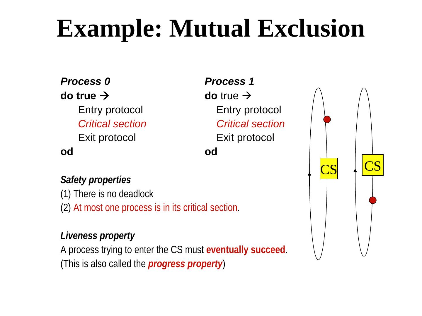 25 .Example: Mutual Exclusion Process 0 Process 1 do true do true Entry protocol Entry protocol Critical section Critical section Exit protocol Exit protocol od od CS CS Safety properties (1) There is no deadlock (2) At most one process is in its critical section. Liveness property A process trying to enter the CS must eventually succeed. (This is also called the progress property)