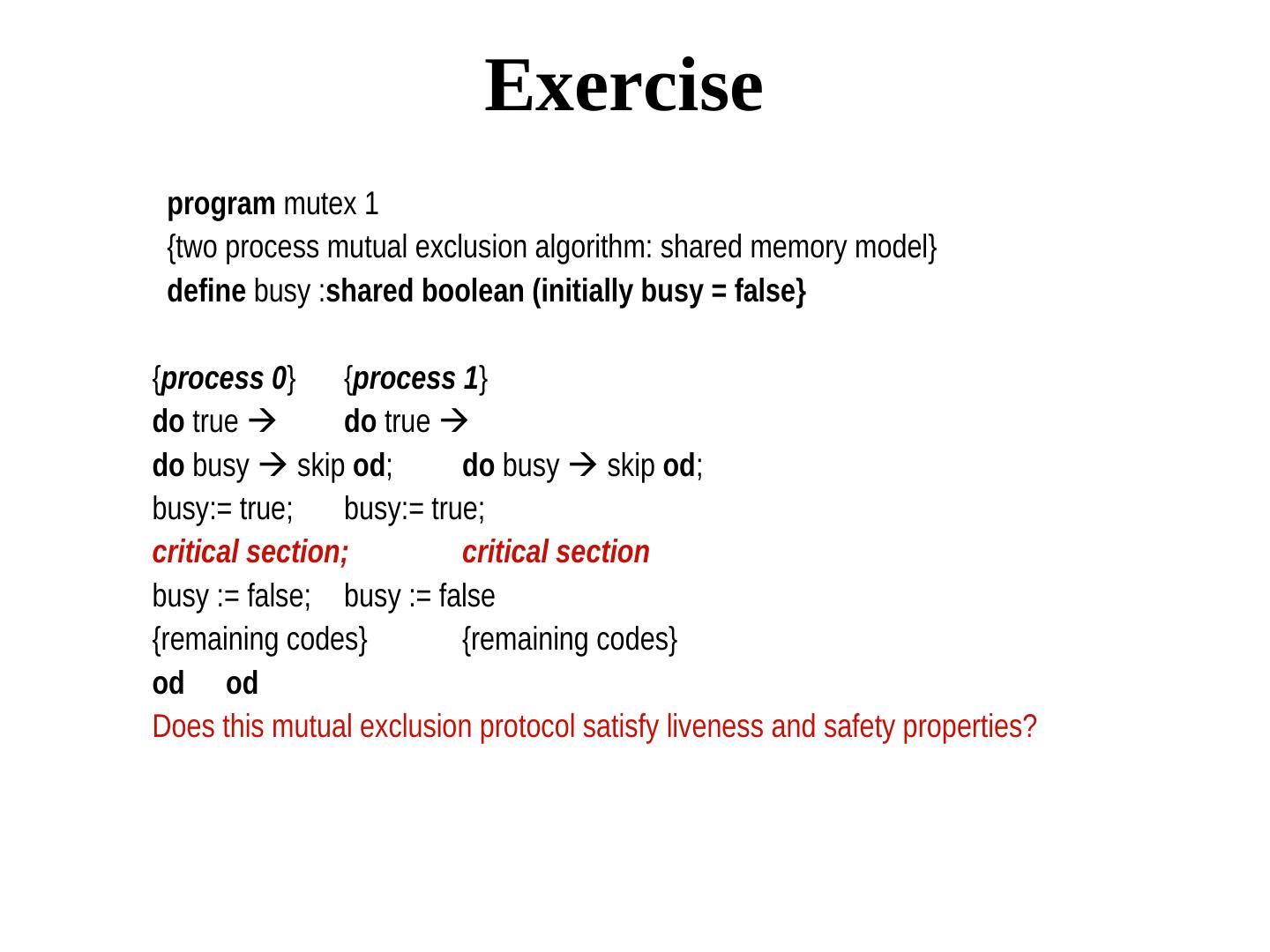 26 . Exercise program mutex 1 {two process mutual exclusion algorithm: shared memory model} define busy :shared boolean (initially busy = false} {process 0} {process 1} do true do true do busy skip od; do busy skip od; busy:= true; busy:= true; critical section; critical section busy := false; busy := false {remaining codes} {remaining codes} od od Does this mutual exclusion protocol satisfy liveness and safety properties?