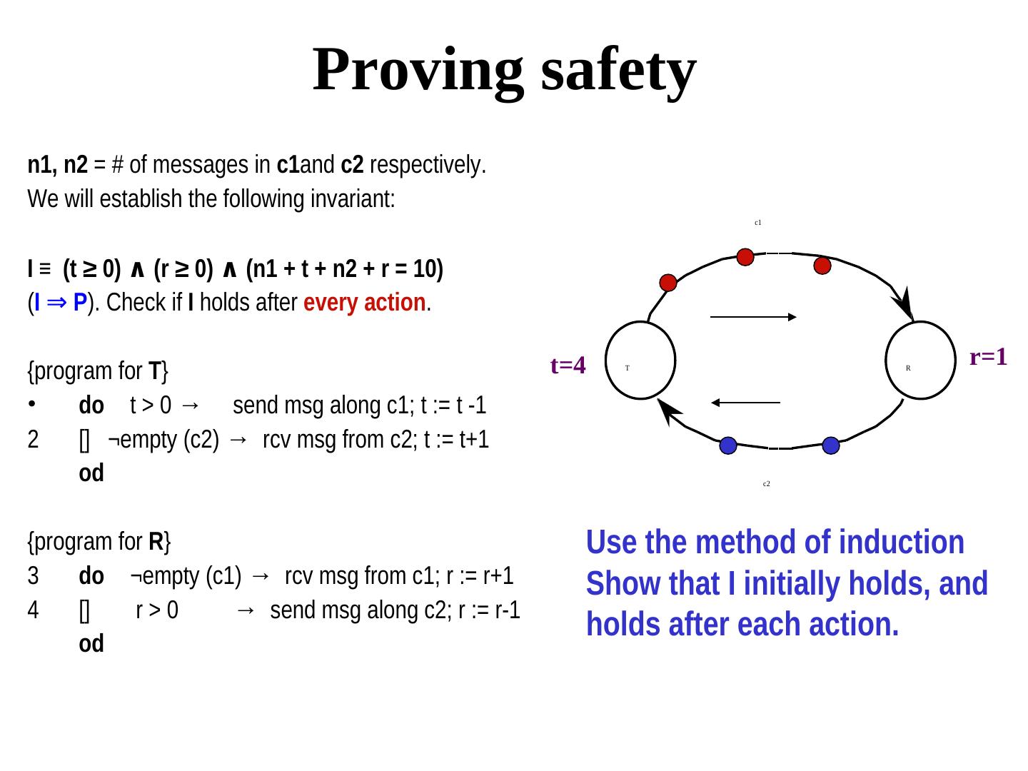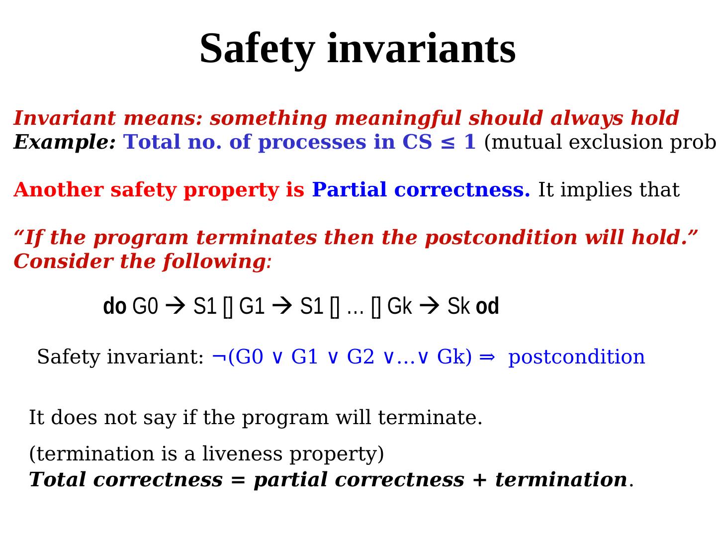 27 . Safety invariants Invariant means: something meaningful should always hold Example: Total no. of processes in CS ≤ 1 (mutual exclusion prob Another safety property is Partial correctness. It implies that “If the program terminates then the postcondition will hold.” Consider the following: do G0 S1 [] G1 S1 [] … [] Gk Sk od Safety invariant: ¬(G0 ∨ G1 ∨ G2 ∨…∨ Gk) ⇒ postcondition It does not say if the program will terminate. (termination is a liveness property) Total correctness = partial correctness + termination.