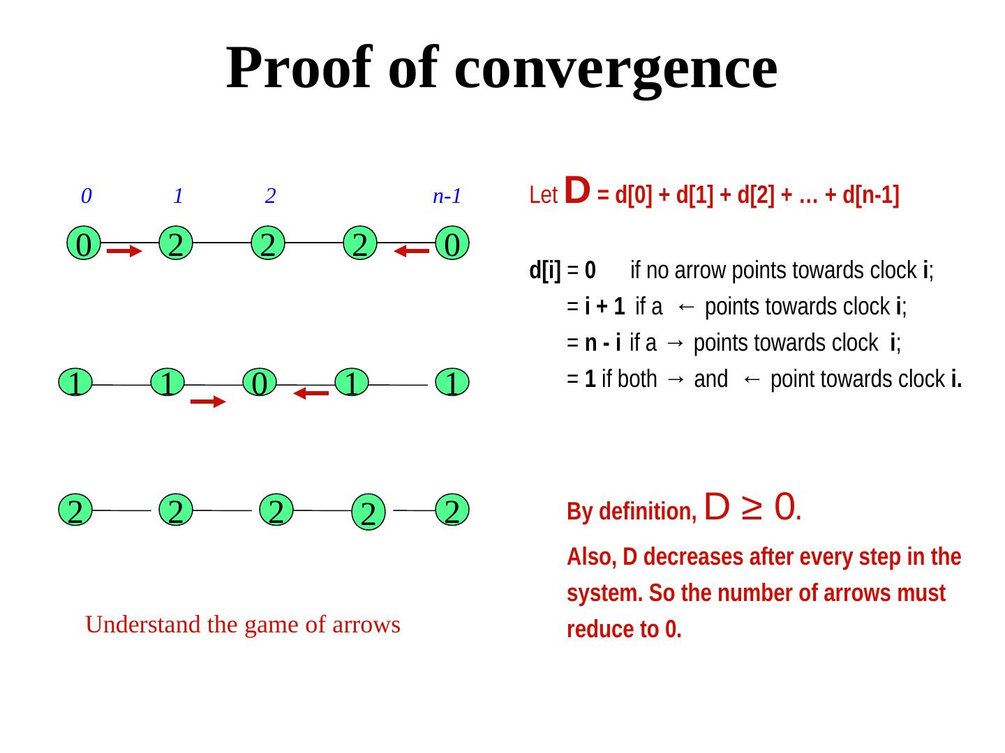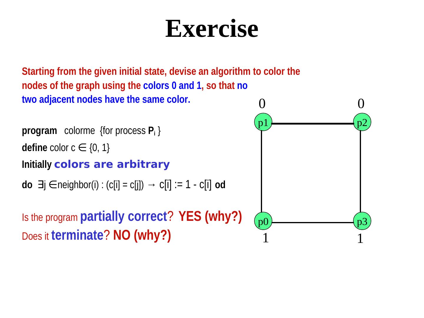 28 . Exercise Starting from the given initial state, devise an algorithm to color the nodes of the graph using the colors 0 and 1, so that no two adjacent nodes have the same color. 0 0 p1 p2 program colorme {for process Pi } define color c ∈ neighbor(i): c(j) = c(i) → c(i) := 1- c(i) {0, 1} Initially colors are arbitrary do ∃j ∈ neighbor(i): c(j) = c(i) → c(i) := 1- c(i)neighbor(i) : (c[i] = c[j]) → c[i] := 1 - c[i] od Is the program partially correct? YES (why?) p0 p3 Does it terminate? NO (why?) 1 1