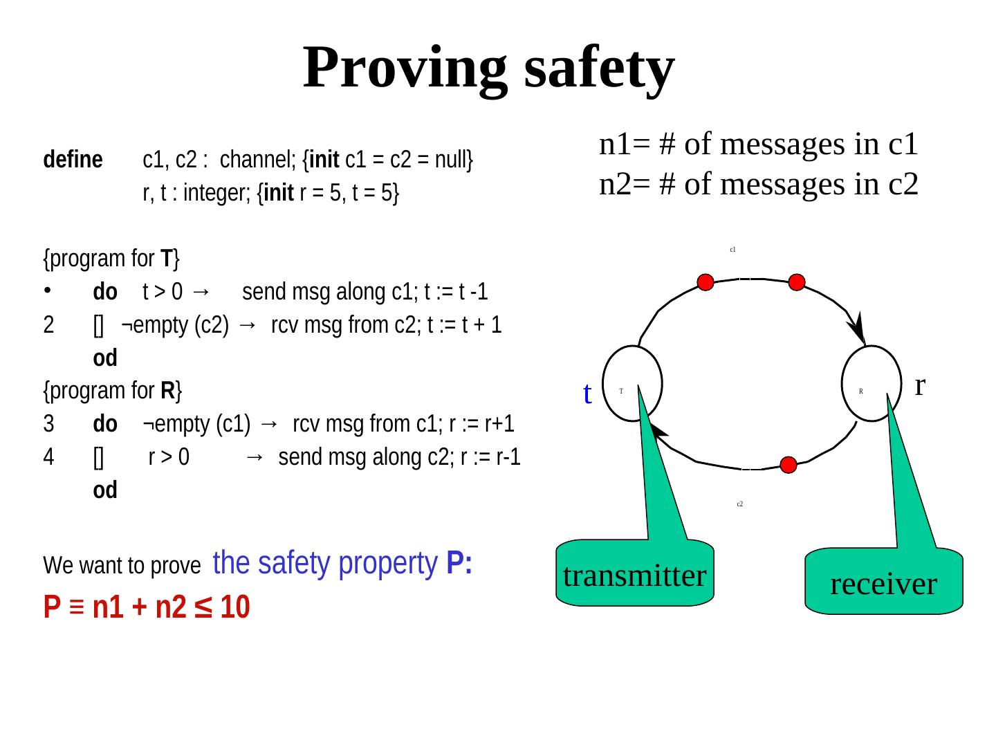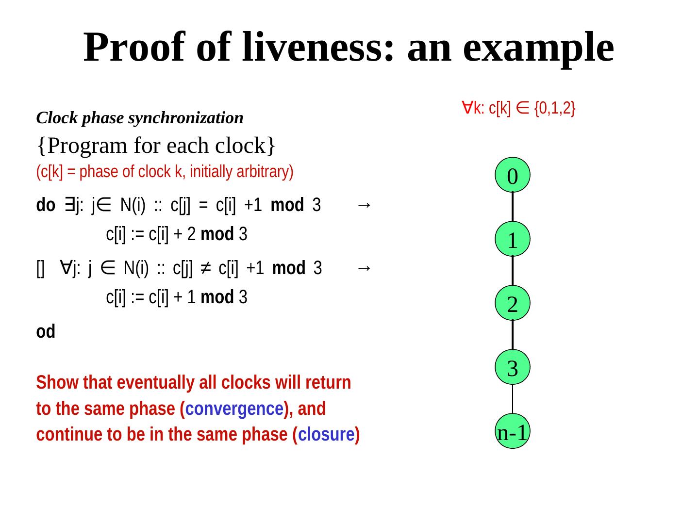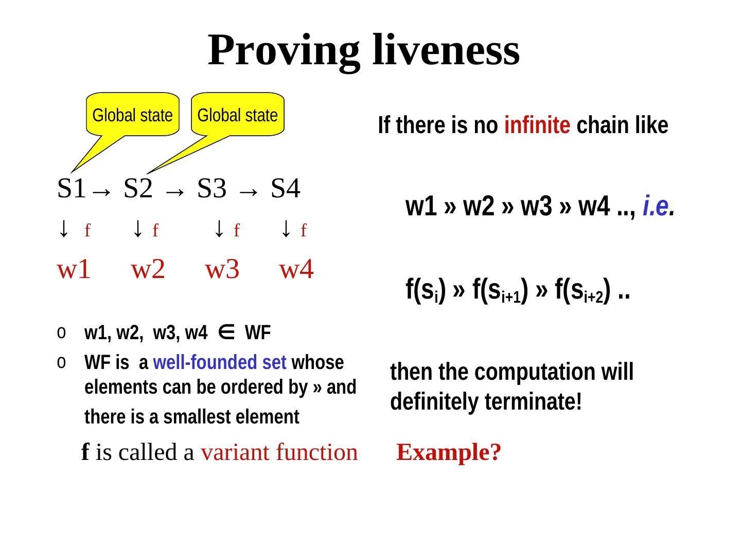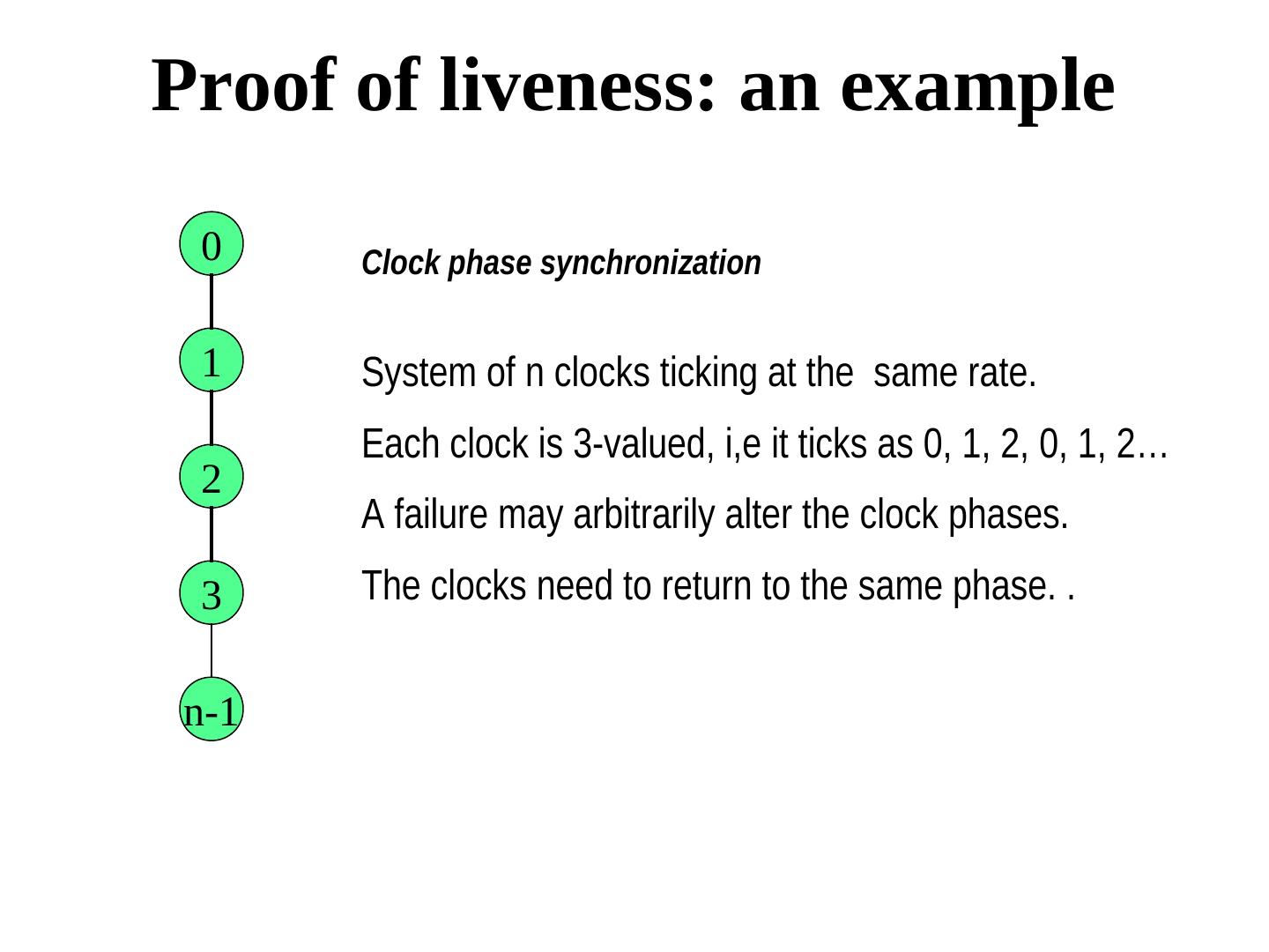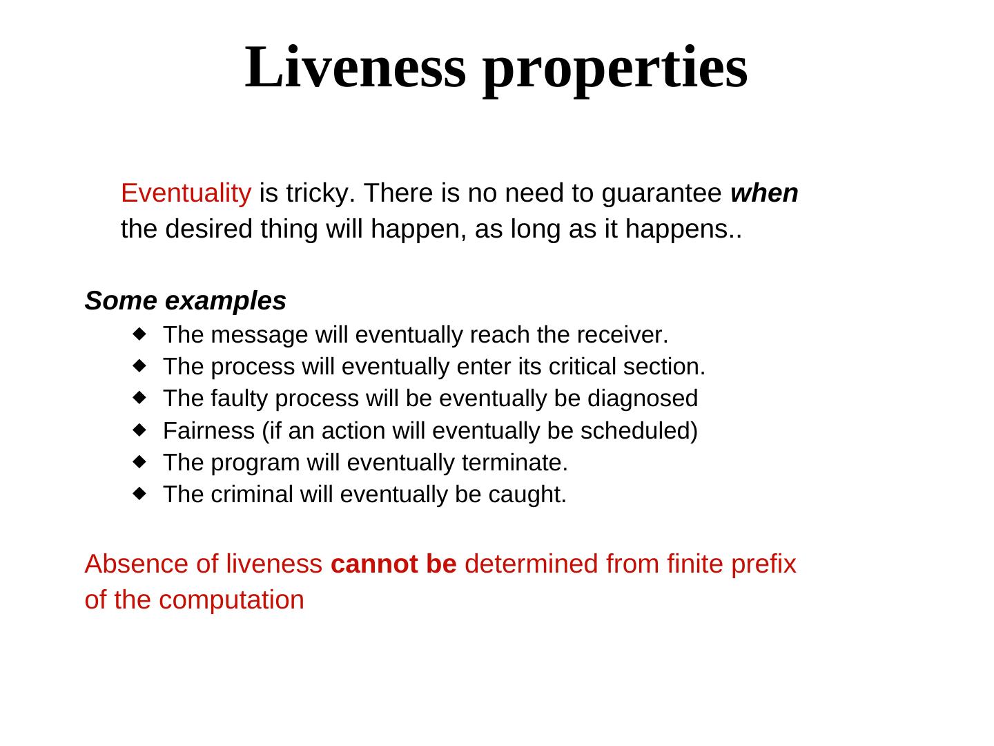 29 . Liveness properties Eventuality is tricky. There is no need to guarantee when the desired thing will happen, as long as it happens.. Some examples The message will eventually reach the receiver. The process will eventually enter its critical section. The faulty process will be eventually be diagnosed Fairness (if an action will eventually be scheduled) The program will eventually terminate. The criminal will eventually be caught. Absence of liveness cannot be determined from finite prefix of the computation