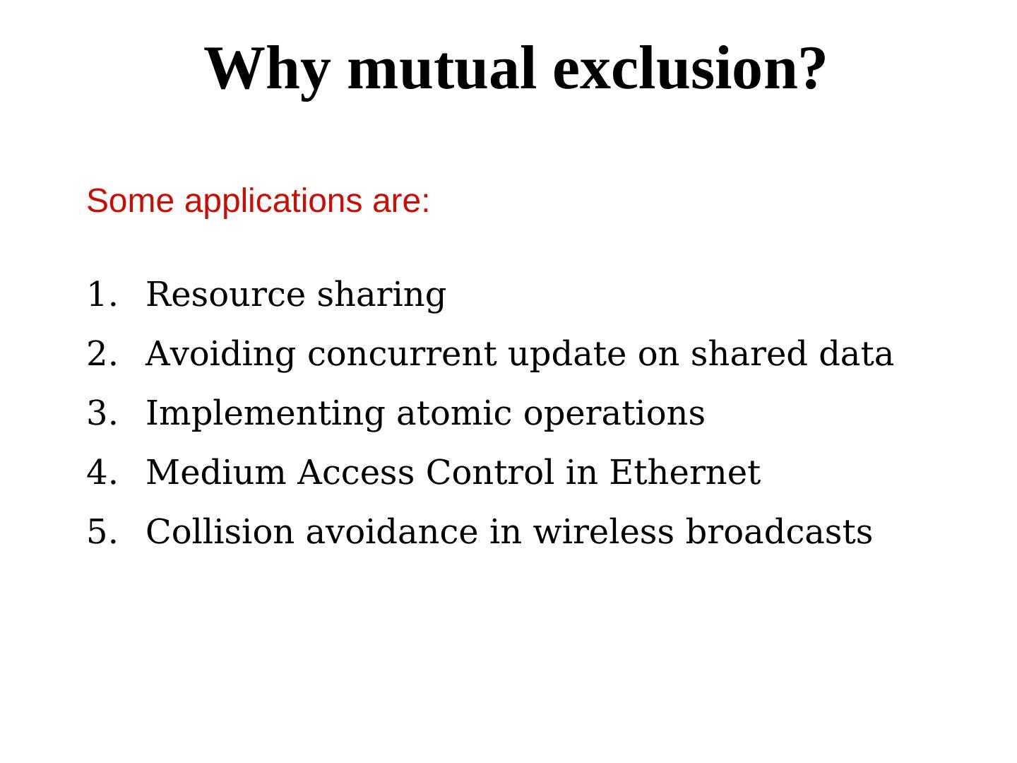 4 . Why mutual exclusion? Some applications are: 1. Resource sharing 2. Avoiding concurrent update on shared data 3. Implementing atomic operations 4. Medium Access Control in Ethernet 5. Collision avoidance in wireless broadcasts