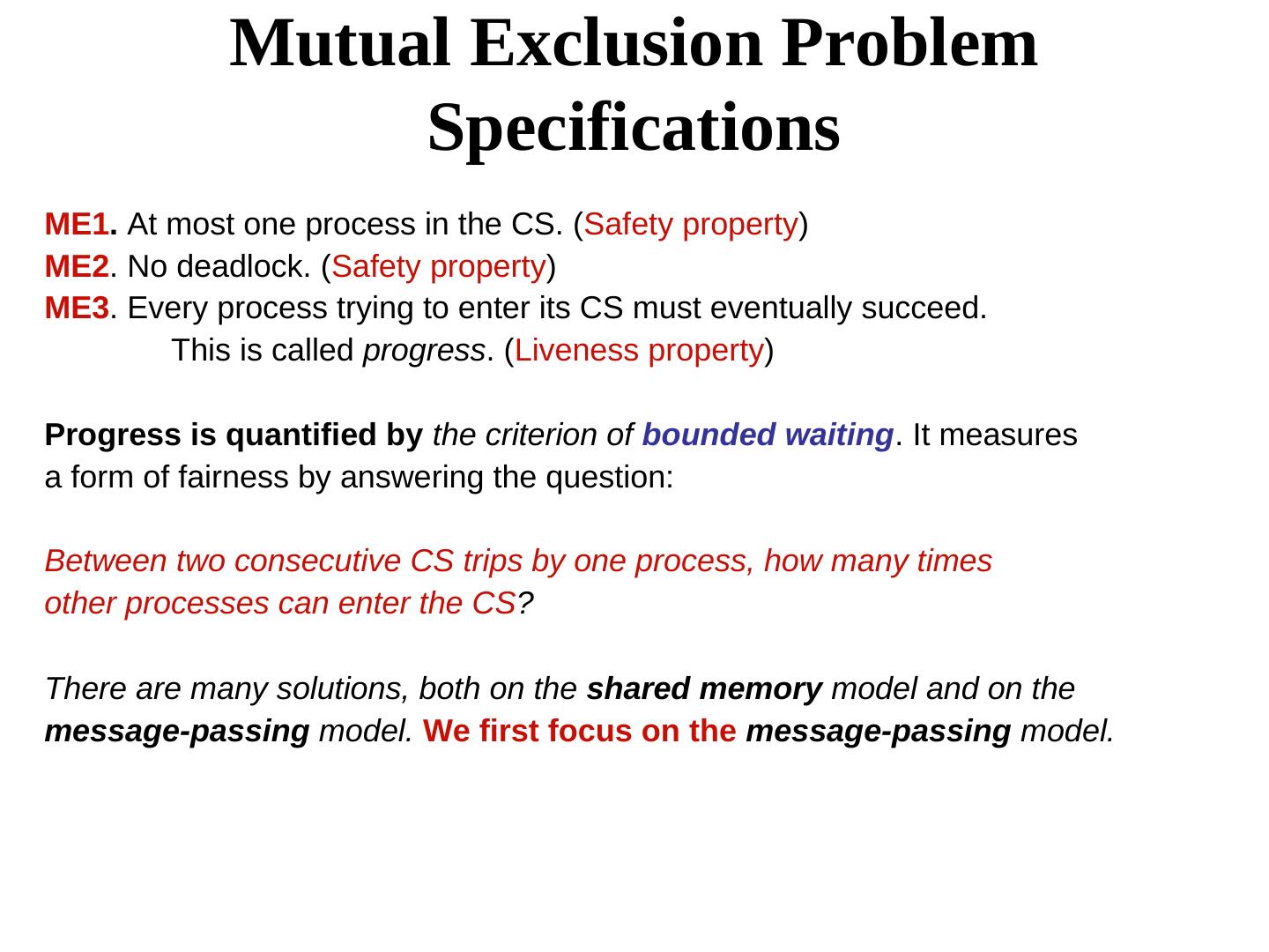 5 . Mutual Exclusion Problem Specifications ME1. At most one process in the CS. (Safety property) ME2. No deadlock. (Safety property) ME3. Every process trying to enter its CS must eventually succeed. This is called progress. (Liveness property) Progress is quantified by the criterion of bounded waiting. It measures a form of fairness by answering the question: Between two consecutive CS trips by one process, how many times other processes can enter the CS? There are many solutions, both on the shared memory model and on the message-passing model. We first focus on the message-passing model.