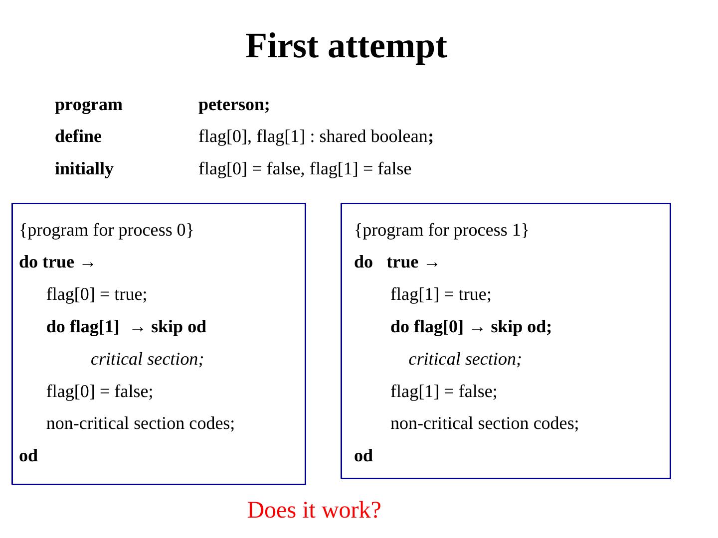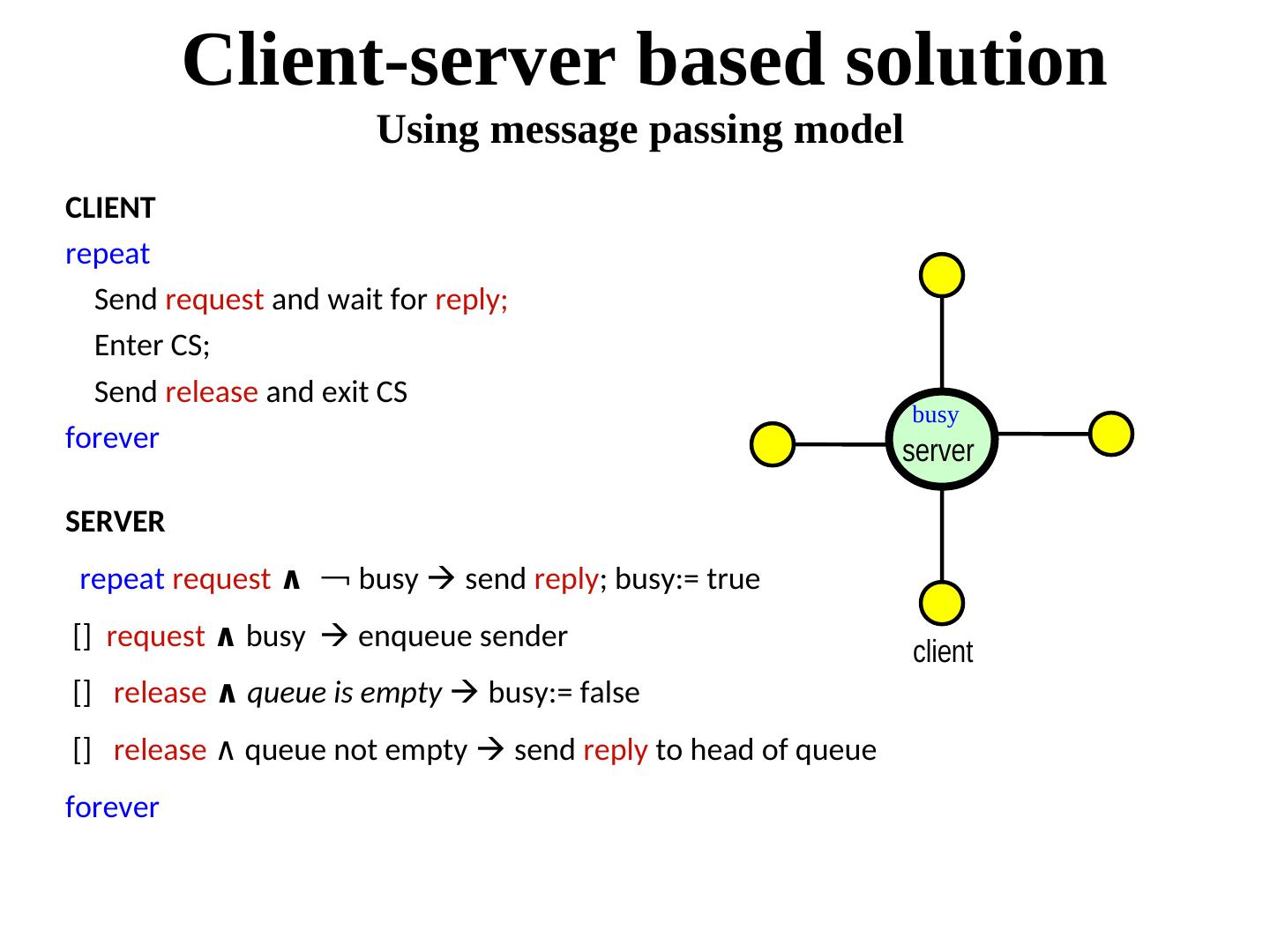 6 . Client-server based solution Using message passing model CLIENT repeat Send request and wait for reply; Enter CS; Send release and exit CS busy forever server SERVER repeat request ∧ ¬ busy send reply; busy:= true [] request ∧ busy enqueue sender client [] release ∧ queue is empty busy:= false [] release ∧ queue not empty queue not empty send reply to head of queue forever