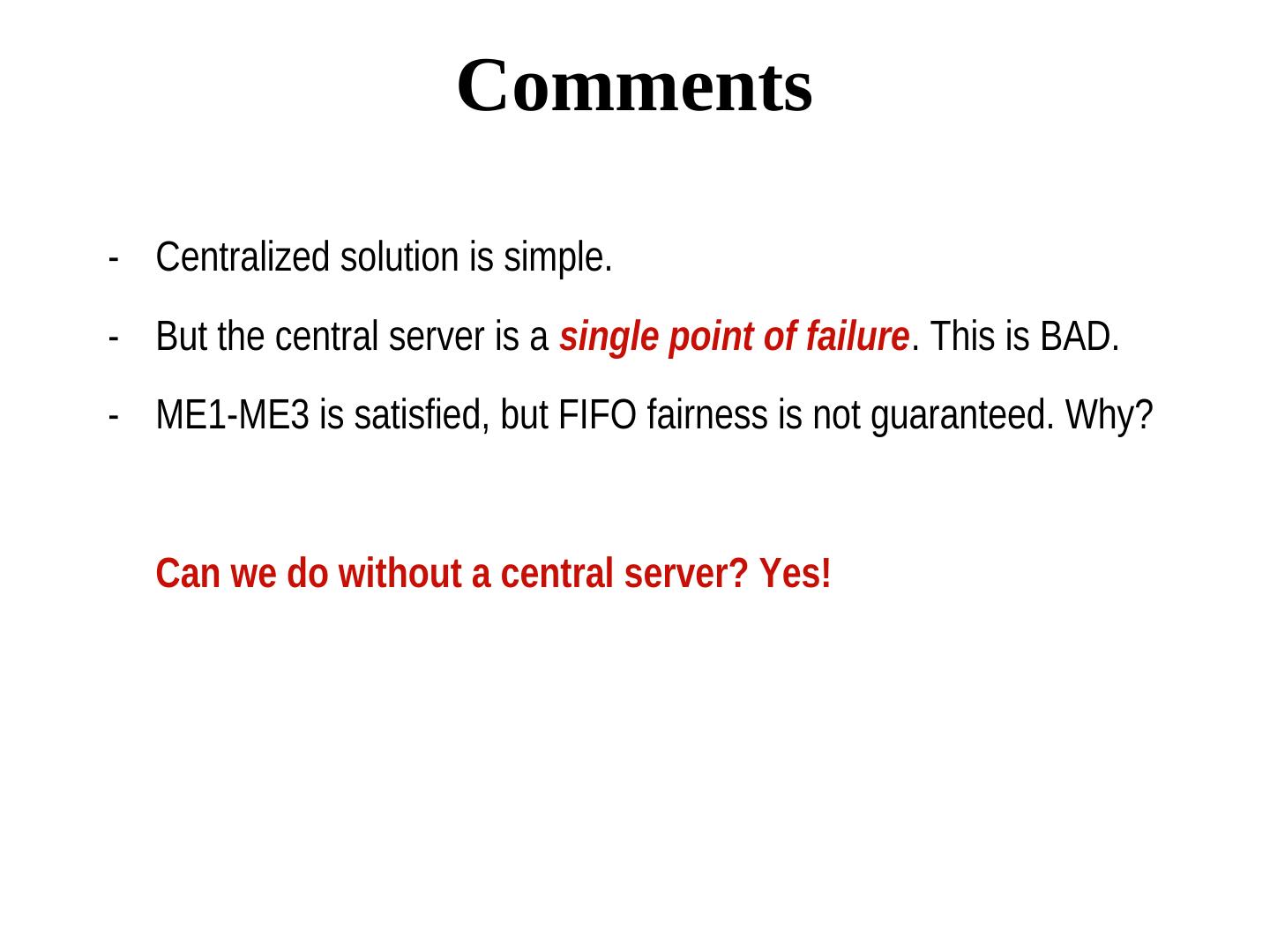7 . Comments - Centralized solution is simple. - But the central server is a single point of failure. This is BAD. - ME1-ME3 is satisfied, but FIFO fairness is not guaranteed. Why? Can we do without a central server? Yes!