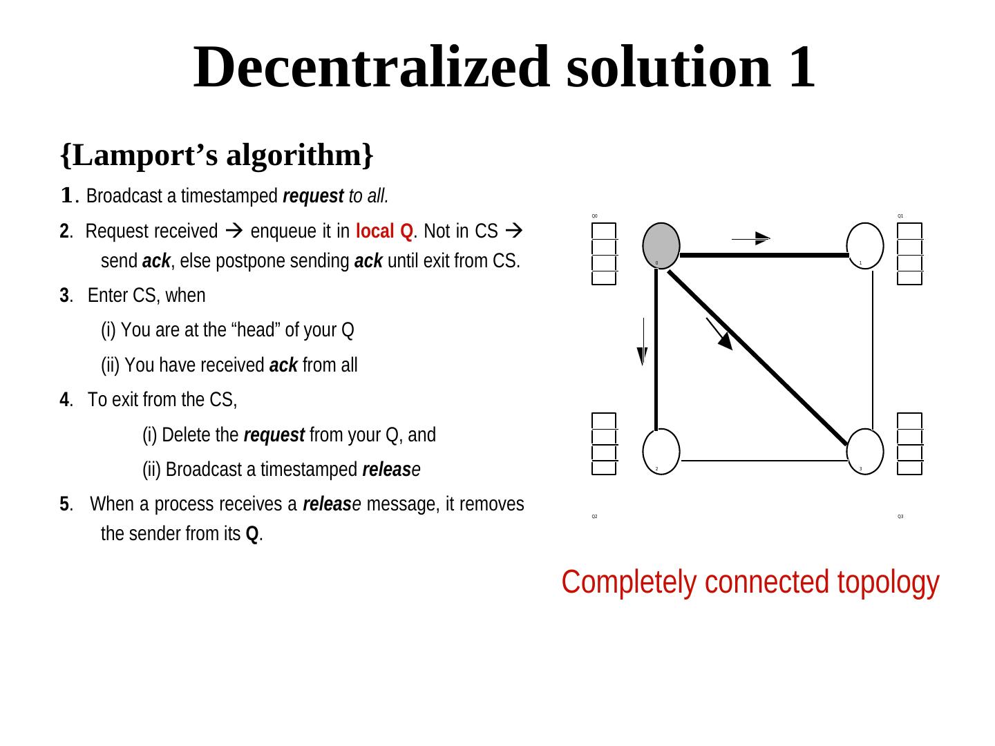 8 . Decentralized solution 1 {Lamport’s algorithm} 1. Broadcast a timestamped request to all. Q0 Q1 2. Request received enqueue it in local Q. Not in CS send ack, else postpone sending ack until exit from CS. 0 1 3. Enter CS, when (i) You are at the “head” of your Q (ii) You have received ack from all 4. To exit from the CS, (i) Delete the request from your Q, and (ii) Broadcast a timestamped release 2 3 5. When a process receives a release message, it removes Q2 Q3 the sender from its Q. Completely connected topology