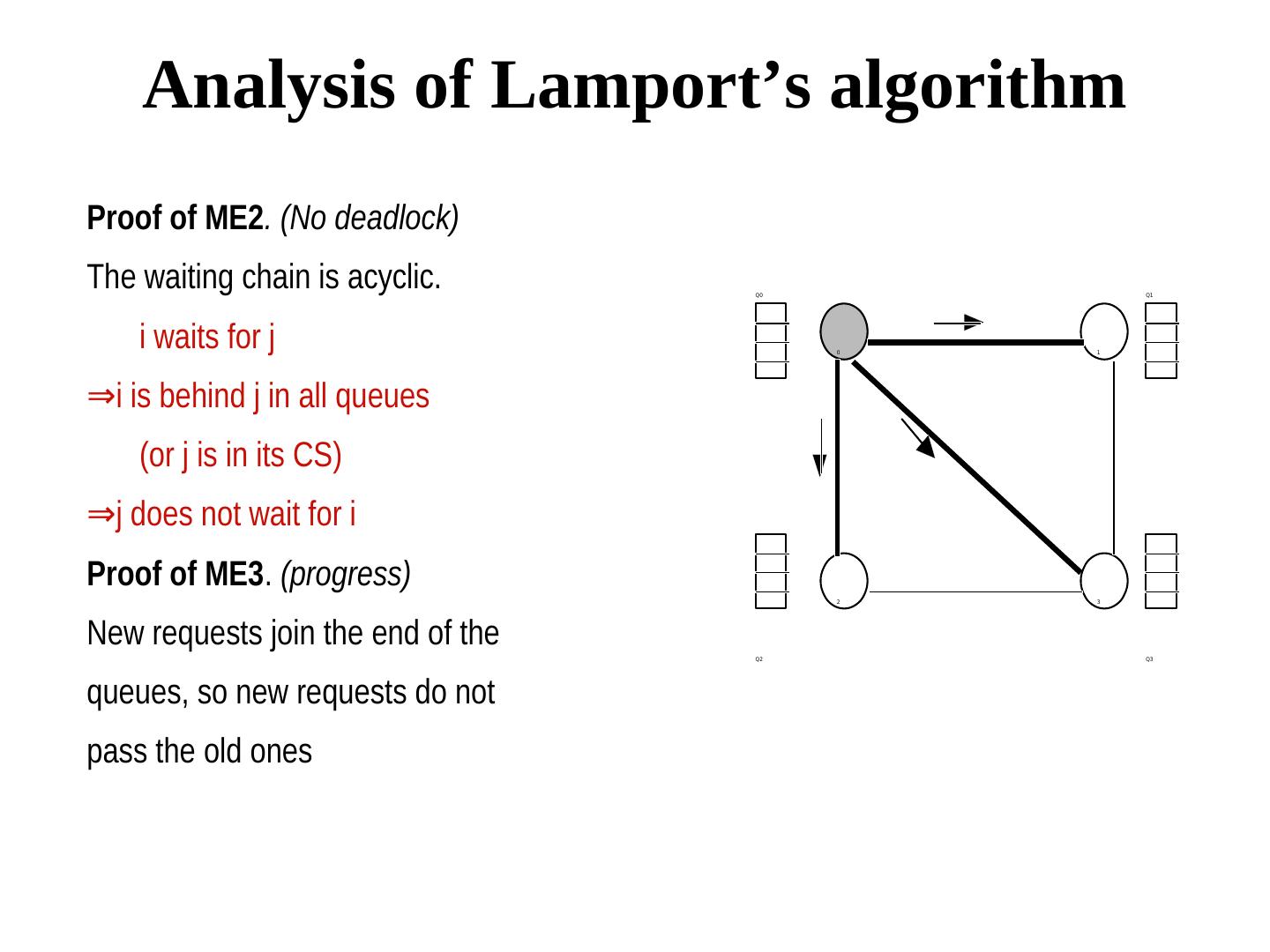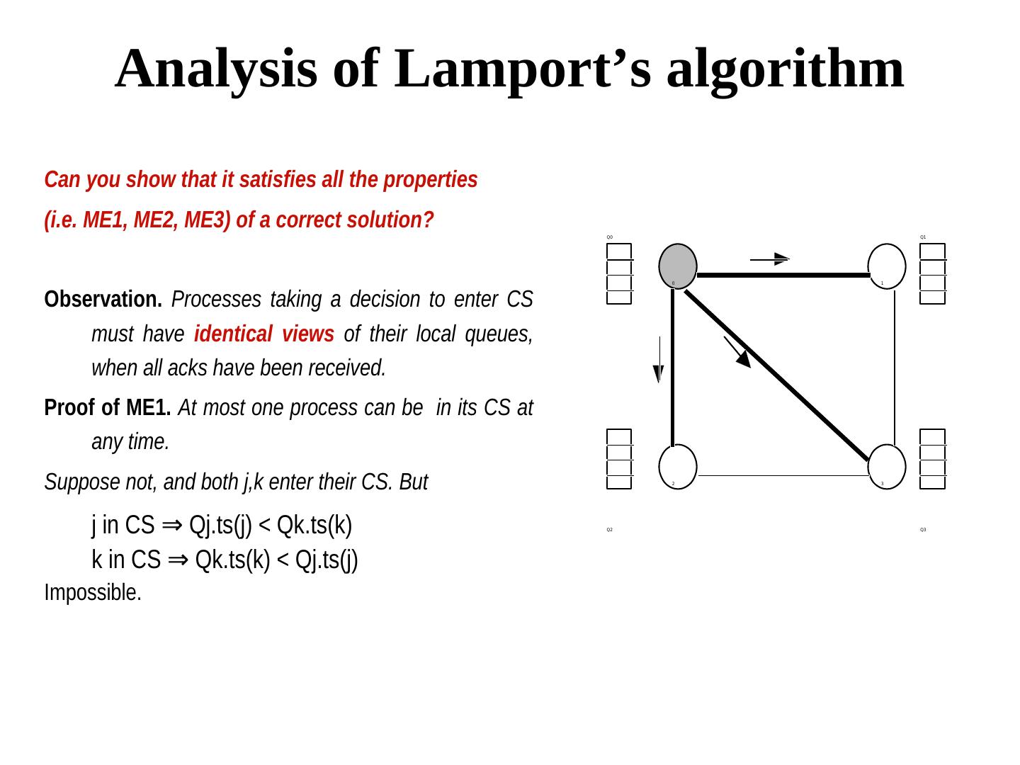 9 . Analysis of Lamport’s algorithm Can you show that it satisfies all the properties (i.e. ME1, ME2, ME3) of a correct solution? Q0 Q1 0 1 Observation. Processes taking a decision to enter CS must have identical views of their local queues, when all acks have been received. Proof of ME1. At most one process can be in its CS at any time. Suppose not, and both j,k enter their CS. But 2 3 j in CS ⇒ Qj.ts(j) < Qk.ts(k) Qj.ts(j) < Qk.ts(k) Q2 Q3 k in CS ⇒ Qj.ts(j) < Qk.ts(k) Qk.ts(k) < Qj.ts(j) Impossible.