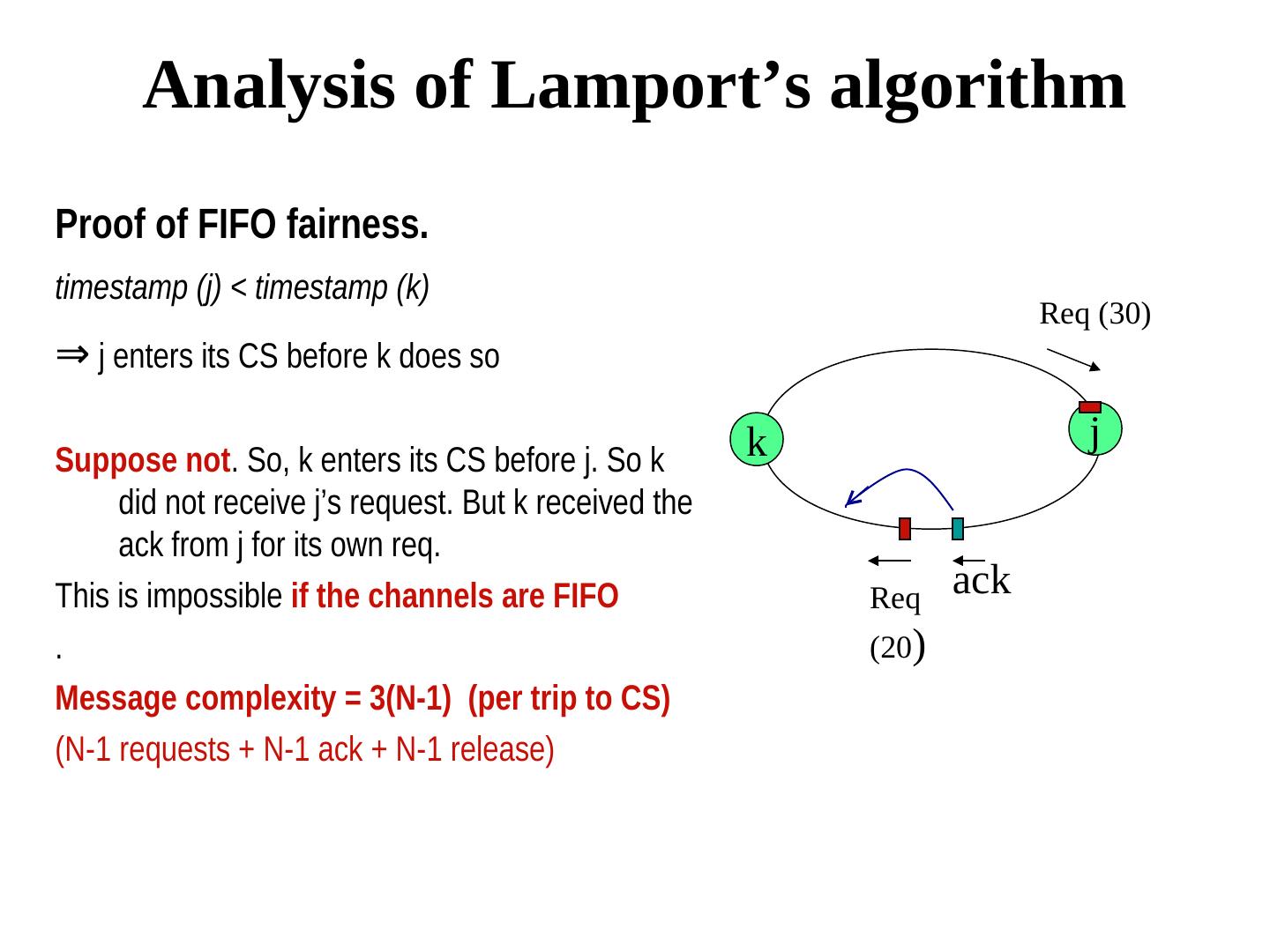 11 . Analysis of Lamport’s algorithm Proof of FIFO fairness. timestamp (j) < timestamp (k) Req (30) ⇒ Qj.ts(j) < Qk.ts(k) j enters its CS before k does so k j Suppose not. So, k enters its CS before j. So k did not receive j’s request. But k received the ack from j for its own req. This is impossible if the channels are FIFO Req ack . (20) Message complexity = 3(N-1) (per trip to CS) (N-1 requests + N-1 ack + N-1 release)