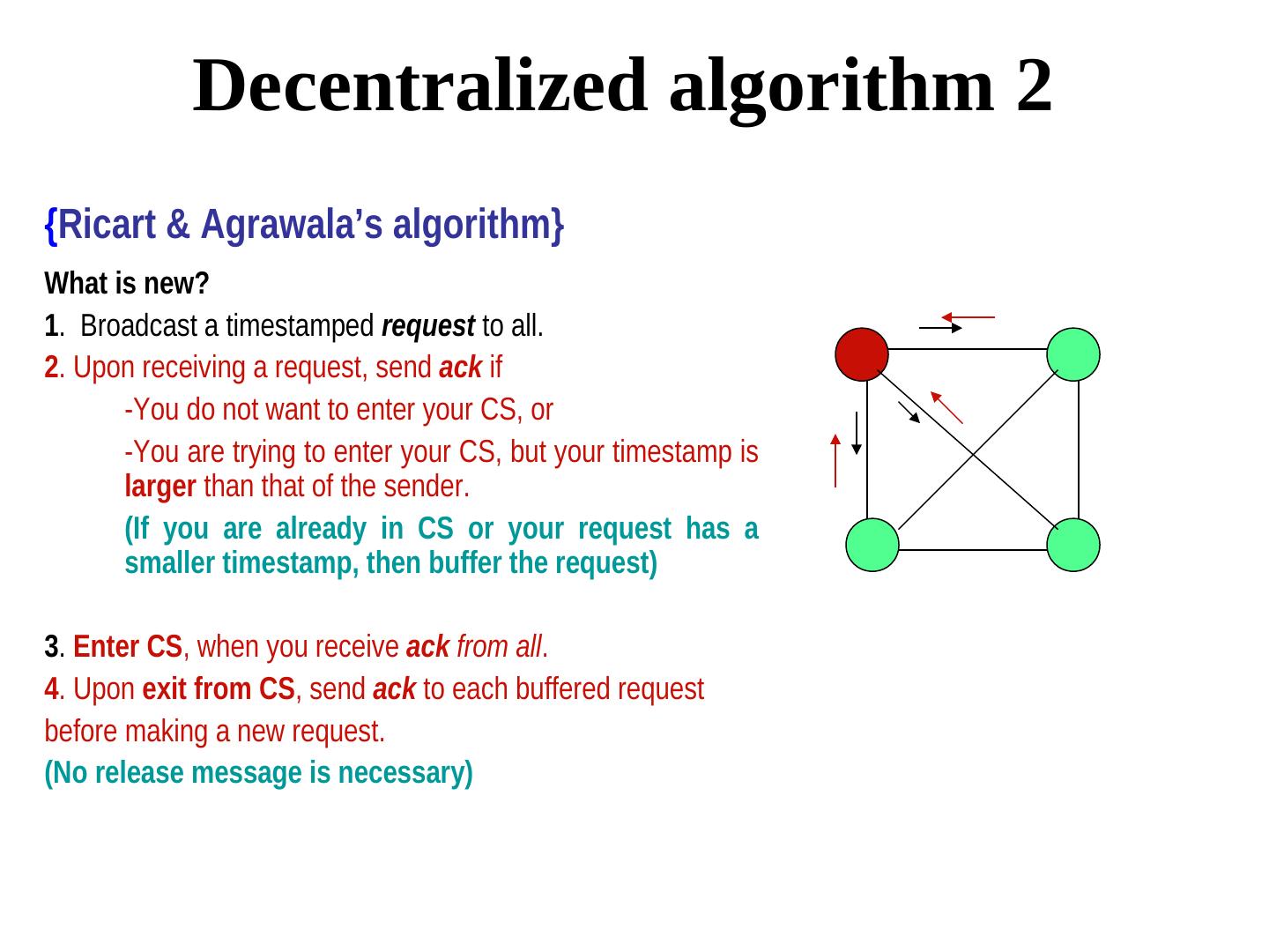 12 . Decentralized algorithm 2 {Ricart & Agrawala’s algorithm} What is new? 1. Broadcast a timestamped request to all. 2. Upon receiving a request, send ack if -You do not want to enter your CS, or -You are trying to enter your CS, but your timestamp is larger than that of the sender. (If you are already in CS or your request has a smaller timestamp, then buffer the request) 3. Enter CS, when you receive ack from all. 4. Upon exit from CS, send ack to each buffered request before making a new request. (No release message is necessary)